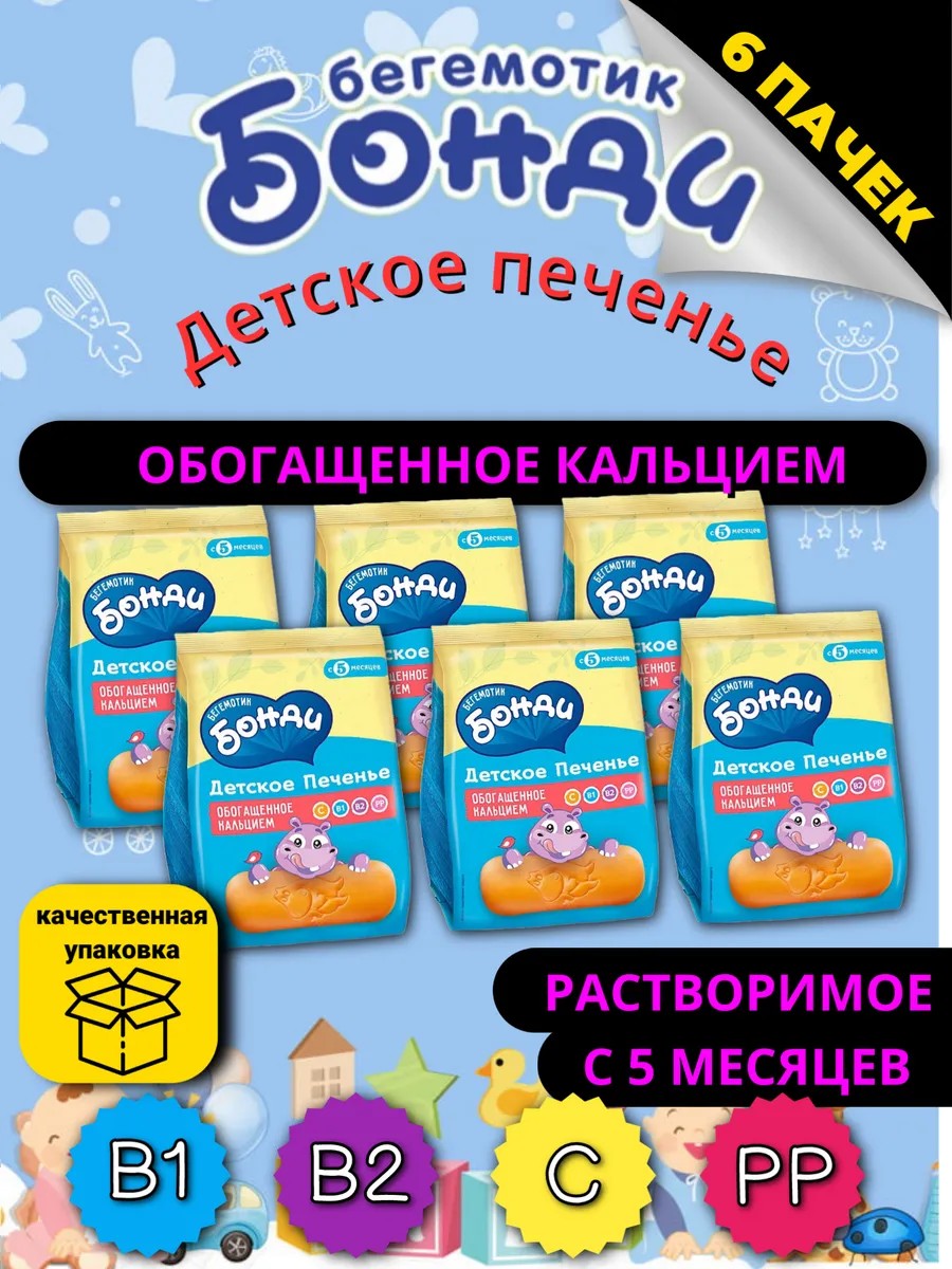 Бегемотик Бонди Печенье детское обогащённое кальцием, 6 пачек по 180г