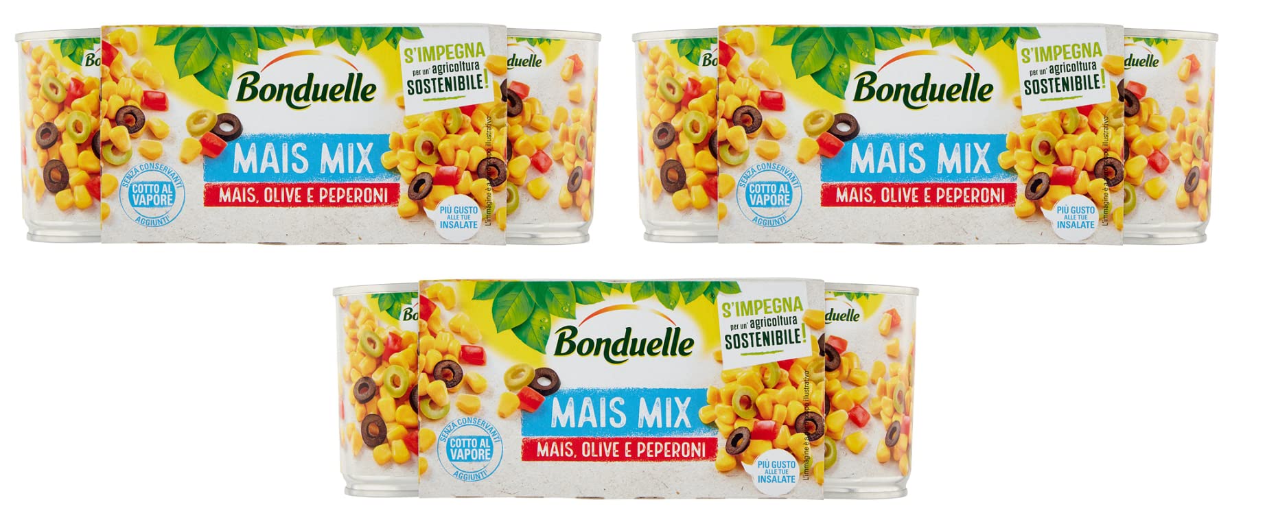 A blend of corn vegetables with green and black olives and bell peppers. Excellent for enriching your salads and also ideal for new uses as a light, oil-free spiced rice. Ingredients: Mixed vegetables (sweetcorn kernels 65 , green olives 6.5 (acidifier E330), black olives 6.5 , red bell pepper 6.5 ), water, salt, thickeners E415 and E412, antioxidant E300. No preservatives in accordance with current legislation. Nutritional values per 100g: Energy (kJ) 314 kJ - Energy (kcal) 76 kcal - Fat (g) 3.5 g of which saturates (g) 0.6 g - Carbohydrate (g) 6.8 g - Sugar (g) 4.6 g - Fiber (g) 4.4 g. INGREDIENTS Mixed vegetables (sweetcorn kernels 65 , green olives 6.5 (acidifier: E330), black olives 6.5 , red peppers 6.5 ), water, salt, thickeners: E415 and E412, antioxidant: E300.Lot de 3 maïs Bonduelle - Mélange de maïs - Olive e Peperoni - Maïs doux et croustillant avec olives et piments (3 x 170 g)DESCRIPTION DU PRODUIT DESCRIPTION DU PRODUIT Mélange de légumes de maïs avec olives vertes et noires et poivrons. Excellent pour enrichir vos salades et également idéal pour de nouvelles utilisations comme riz à épices léger et sans huile. Ingrédients : légumes mélangés (maïs de sucre en grains 65 , olives vertes 6,5 (acidifiant E330), olives noires 6,5 , poivron rouge 6,5 ), eau, sel, épaississant E415 et E412, agents antioxydants E300. Sans conservateurs conformément à la législation en vigueur. Valeur nutritive pour 100 g : énergie (kJ) 314 kJ - énergie (kcal) 76 kcal - graisses (g) 3,5 g dont acides gras saturés (g) 0,6 g glucides (g) 6,8 g de sucre (g) 4,6 g de fibres (g) 4,4 g. INGRÉDIENTS Légumes mélangés (maïs sucré en grains 65 , olives vertes 6,5 (acidifiant : E330), olives noires 6,5 , poivrons rouges 6,5 ), eau, sel, épaississant: E415 et E412, antioxydant : E300.