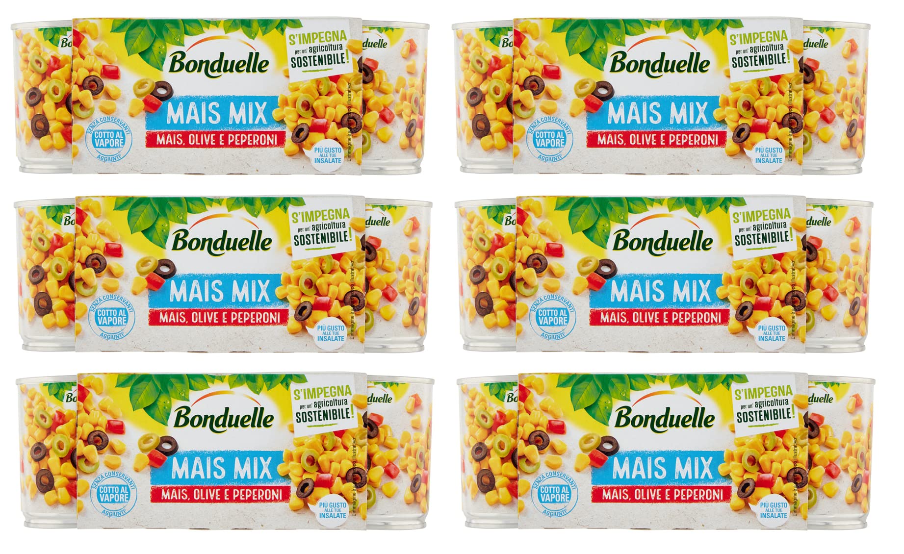 A blend of corn vegetables with green and black olives and bell peppers. Excellent for enriching your salads and also ideal for new uses as a light, oil-free spiced rice. Ingredients: Mixed vegetables (sweetcorn kernels 65 , green olives 6.5 (acidifier E330), black olives 6.5 , red bell pepper 6.5 ), water, salt, thickeners E415 and E412, antioxidant E300. No preservatives in accordance with current legislation. Nutritional values per 100g: Energy (kJ) 314 kJ - Energy (kcal) 76 kcal - Fat (g) 3.5 g of which saturates (g) 0.6 g - Carbohydrate (g) 6.8 g - Sugar (g) 4.6 g - Fiber (g) 4.4 g. INGREDIENTS Mixed vegetables (sweetcorn kernels 65 , green olives 6.5 (acidifier: E330), black olives 6.5 , red peppers 6.5 ), water, salt, thickeners: E415 and E412, antioxidant: E300.Lot de 6 maïs Bonduelle - Mélange de maïs - Olive e Peperoni - Maïs doux et croustillant avec olives et piments (3 x 170 g)DESCRIPTION DU PRODUIT DESCRIPTION DU PRODUIT Mélange de légumes de maïs avec olives vertes et noires et poivrons. Excellent pour enrichir vos salades et également idéal pour de nouvelles utilisations comme riz à épices léger et sans huile. Ingrédients : légumes mélangés (maïs de sucre en grains 65 , olives vertes 6,5 (acidifiant E330), olives noires 6,5 , poivron rouge 6,5 ), eau, sel, épaississant E415 et E412, agents antioxydants E300. Sans conservateurs conformément à la législation en vigueur. Valeur nutritive pour 100 g : énergie (kJ) 314 kJ - énergie (kcal) 76 kcal - graisses (g) 3,5 g dont acides gras saturés (g) 0,6 g glucides (g) 6,8 g de sucre (g) 4,6 g de fibres (g) 4,4 g. INGRÉDIENTS Légumes mélangés (maïs sucré en grains 65 , olives vertes 6,5 (acidifiant : E330), olives noires 6,5 , poivrons rouges 6,5 ), eau, sel, épaississant: E415 et E412, antioxydant : E300.