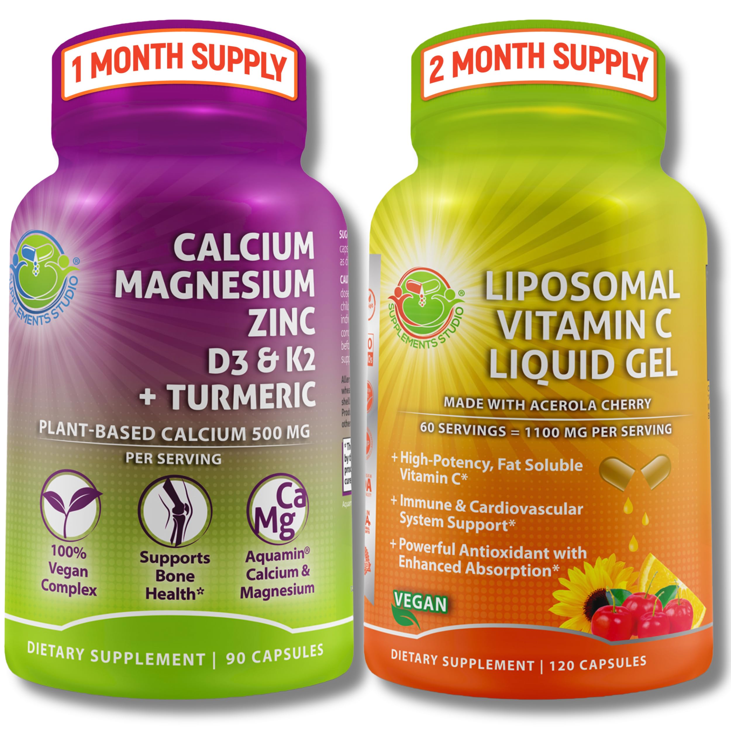Unlock daily support with this powerhouse supplement bundle! Our Liposomal Vitamin C Liquid Gel delivers 1100mg of vitamin C enriched with organic acerola cherry for high potency and antioxidant support. This formula is encapsulated in delayed-release capsules for optimal absorption without added sugars, liquids, or fillers. Paired with our Plant-Based Calcium Complex featuring Aquamin from red marine algae, this combination offers calcium, magnesium, zinc, turmeric, D3, and K2 to support mineral balance, active lifestyle, and overall health. Both supplements are non-GMO and free from fillers and additives. Crafted in a GMP-certified facility, this clean and effective duo helps you maintain energy, immune function, and daily vitality.Proudly Made in the U.S.: All our supplements are manufactured with rigorous quality control standards and strict adherence to current Good Manufacturing Practices (cGMP). Made with high quality natural and vegan non-GMO ingredients. Clean Non-GMO: Crafted with your health in mind, our products contain high-grade vitamins, minerals, and nutrients without the unwanted extras. Free from fillers like rice flour, magnesium stearate, and silicon dioxide, so you can trust what you're putting into your body. Formulated with integrity and transparency. Targeted Wellness Support: Together, these formulas support immune function, nutrient absorption, active lifestyle, and overall vitality. Vitamin C supports collagen production and iron utilization, while the calcium complex supports bone health and overall vitality. High-Absorption Liposomal Vitamin C (2-Month Supply): Delivers 1100mg of liposomal vitamin C liquid-gel (per serving) in delayed release capsules for enhanced absorption and maximum effectiveness. Gentle on your stomach. Enriched with organic acerola cherry, naturally rich in vitamin C, for an extra boost of nutrients. Calcium 500mg, Magnesium, Zinc D3, K2 Turmeric (1-Month Supply): 7-in-1 bone health complex containing plant-based calcium magnesium from Aquamin red algae, zinc (as zinc picolinate), organic turmeric, Vitamin K2, Vitamin D3 from lichen, and black pepper for enhanced bioavailability. Supports bone health and muscle function.