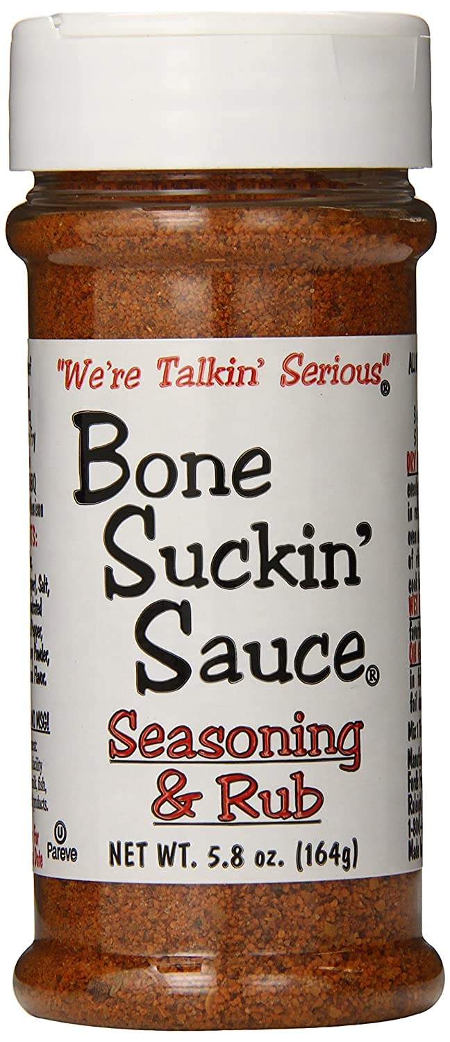 You'll wonder how you ever lived without it! Bone Suckin' Seasoning Rub is a proprietary blend of brown sugar, paprika, garlic, and spices that's perfect for marinating and barbecuing—even popcorn and salads. Great on ribs, pork, beef, chicken, seafood, venison, beans, pasta, vegetables, steaks… just about anything. INGREDIENTS Brown sugar, spices (including chili pepper), salt, sugar, paprika, dehydrated garlic, onion, bell pepper, mustard flour, celery powder, citric acid, and natural flavor. You'll wonder how you ever lived without it! Bone Suckin' Seasoning Rub is a proprietary blend of brown sugar, paprika, garlic, and spices that's perfect for marinating and barbecuing—even popcorn and salads. Great on ribs, pork, beef, chicken, seafood, venison, beans, pasta, vegetables, steaks… just about anything. INGREDIENTS Brown sugar, spices (including chili pepper), salt, sugar, paprika, dehydrated garlic, onion, bell pepper, mustard flour, celery powder, citric acid, and natural flavor.Bone Suckin Sauce Bone Suckin' Assaisonnement et Rub, 164 gDESCRIPTION DU PRODUIT DESCRIPTION DU PRODUIT Vous vous demanderez comment vous avez jamais vécu sans elle! Bone Suckin' Seasoning Rub est un mélange exclusif de cassonade, de paprika, d'ail et d'épices qui est parfait pour mariner et barbecue - même pop-corn et salades. Idéal sur les côtes, le porc, le boeuf, le poulet, les fruits de mer, la venison, les haricots, les pâtes, les légumes, les steaks… à peu près tout. INGRÉDIENTS sucre brun, épices (y compris le piment), sel, sucre, paprika, ail déshydraté, oignon, poivron cloche, farine de moutarde, poudre de céleri, acide citrique et saveur naturelle.