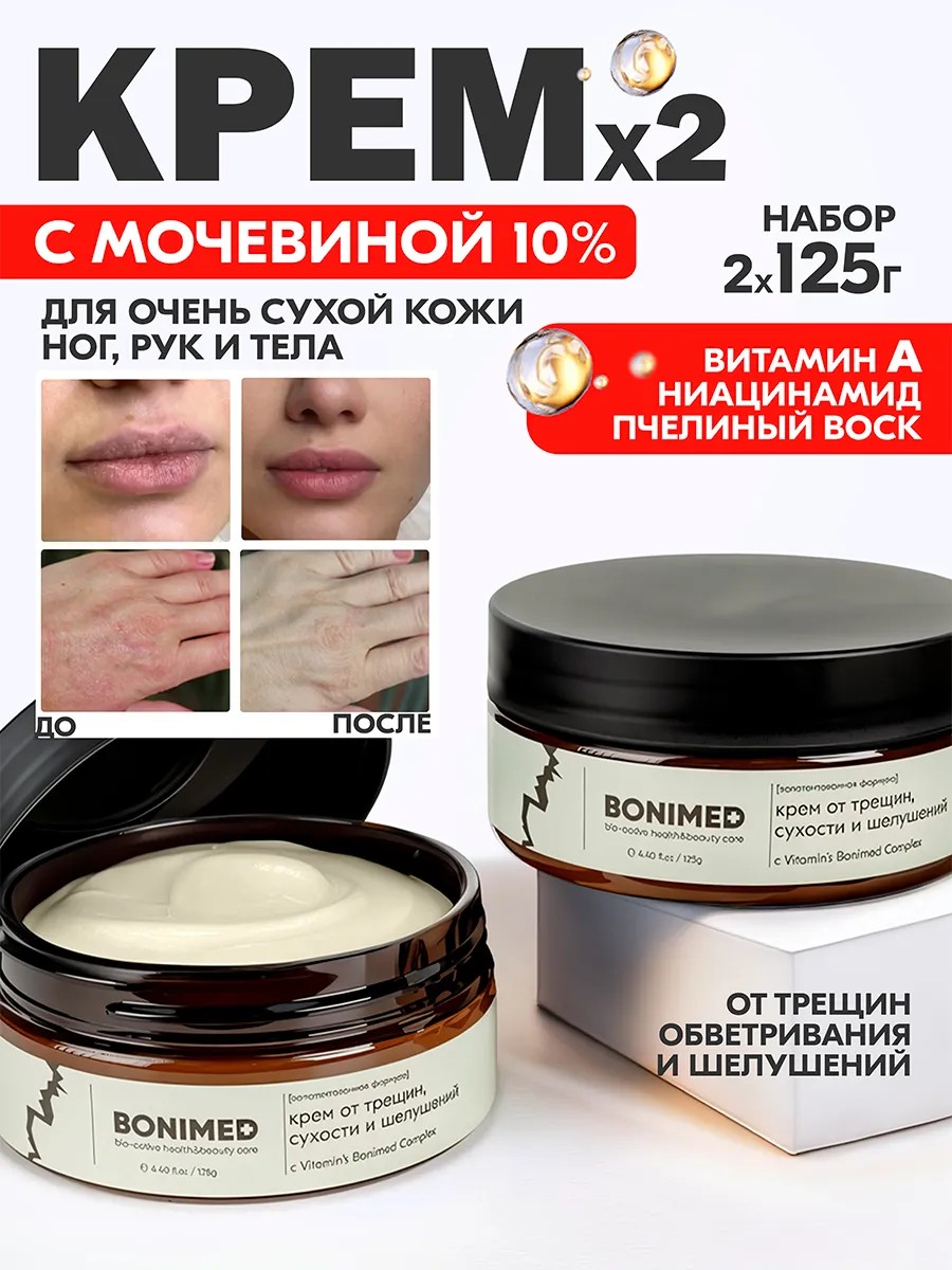 Крем BONIMED с мочевиной, пчелиным воском, алоэ и ниацинамидом — это эффективное средство для смягчения, заживления и глубокого увлажнения кожи.