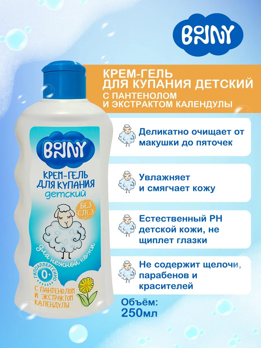 BONNY Baby Bath Cream-Gel with Panthenol and Calendula Extract. This fragrant bath gel with a creamy texture easily whips into a fluffy foam, gently and carefully cleansing the skin. It has a nourishing and moisturizing effect, protects against dryness, and leaves skin velvety and smooth. This soap imparts a long-lasting fresh scent to baby's skin. The thick, soft foam, with mild natural foaming agents, gently cleanses and moisturizes the skin, providing delicate care. It spreads evenly over the skin and rinses easily with water, providing a delight for the whole family.