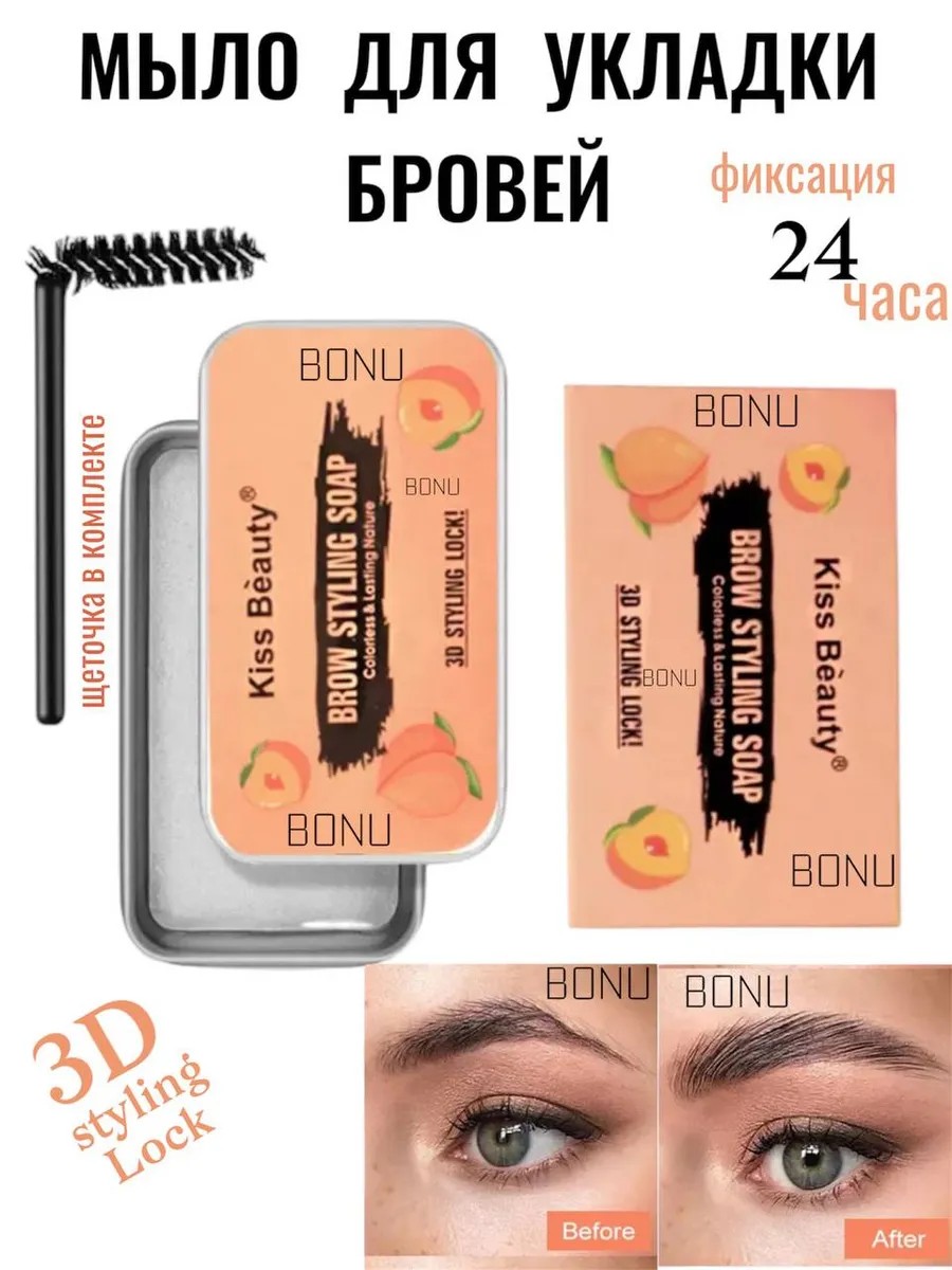 Brow soap with a laminating effect. This clear brow gel with a miniature brush allows you to instantly shape and style your brows, reliably maintaining a perfect shape and a well-groomed appearance. Can be used alone or over another brow product. This gel-soap will suit any brow color and shape. The best cosmetics for girls! This cosmetic soap can be applied alone or combined with a brow pencil. It's a low-cost product, as it's already a solid consistency and won't dry out in the packaging. For a neat look, simply spray a little water onto the brush (included), apply the required amount of gel, and thoroughly comb through your brows, ensuring the product is evenly distributed. Finally, comb and blend your brows. Your girlfriend will be delighted with this gift and a new addition to her makeup bag. This eyebrow kit is perfect for traveling or meeting friends. It's used by professional beauty professionals to create stellar makeup looks. This clear gel-soap is an innovative styling method that replaces traditional methods like brow wax or setting gel. Be beautiful every day!