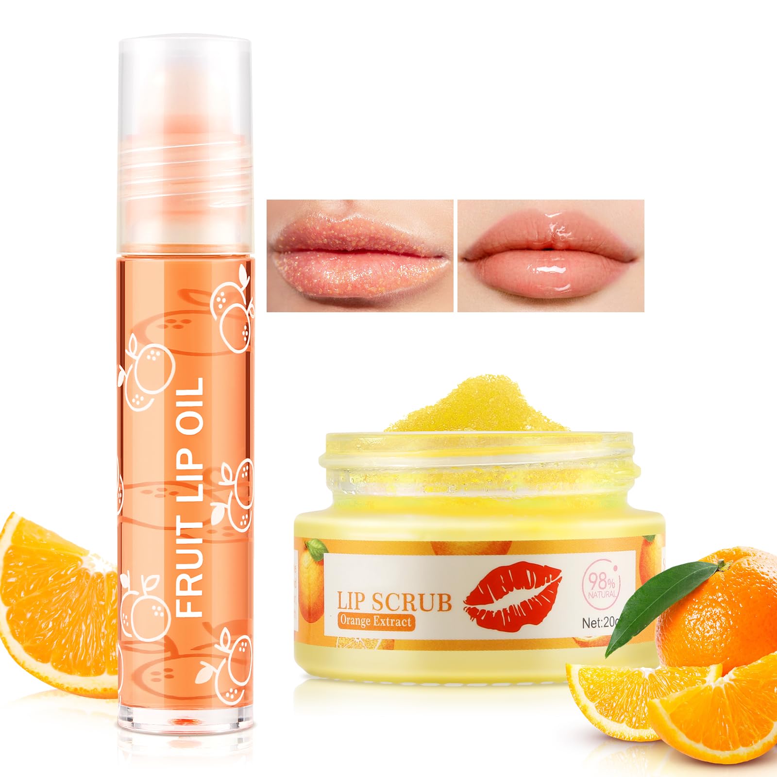 Boobeen Lip Scrub Set Sugar Lip Scrubber Exfoliator and Hydrating Lip Oil Moisturizer for Dry Cracked Peel Lips Fruit Flavoured Lip Care Delicate and Smooth 02# Orange