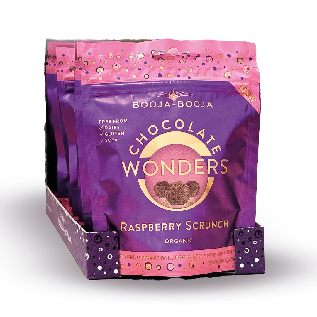 Chocolate Wonders are surprisingly delicious new adventures from Booja-Booja. Created for those everyday moments when you just want a little Booja-Booja tickle, they come in convenient, resealable treat bags. There are four irresistible flavors: Hazelnut, Cookie Dough, Salted Caramel, and Raspberry Scrunch. Each bag is 100 recyclable. Chocolate Wonders are created to bring a little fun and wonder to every day, at home or on the go. Like all Booja-Booja treats, they are dairy-free, gluten-free, soy-free, vegan, organic, and absolutely delicious. INGREDIENTS Ingredients: Chocolate (cocoa mass , cane sugar , cocoa butter , vanilla powder ), coconut oil , honeycomb (cane sugar , coconut syrup ) 10 , freeze-dried raspberries 1 . Organic ingredient. Also contains nuts. We use nuts throughout our factory and processes. Chocolate: minimum 55 cocoa solidsBooja - Booja, Framboise Scrunch Vegan Chocolate Wonders Bulles de chocolat de la taille d'une bouchée, 8 x 65 gDESCRIPTION DU PRODUIT DESCRIPTION DU PRODUIT Chocolate Wonders sont de nouvelles aventures étonnamment délicieuses de Booja-Booja. Créés pour les moments quotidiens où vous voulez juste un petit chatouillement de Booja-Booja, ils sont livrés dans des sacs à friandises pratiques et refermables. Il y a quatre saveurs irrésistibles : noisette, pâte à biscuits, caramel salé et framboise Scrunch. Chaque sac est 100 recyclable. Chocolate Wonders est créé pour apporter un peu de plaisir et d'émerveillement chaque jour, à la maison ou en déplacement. Comme toutes les friandises Booja-Booja, elles sont sans produits laitiers, sans gluten, sans soja, végétaliennes, biologiques et absolument délicieuses. INGRÉDIENTS Ingrédients : Chocolat (pâte de cacao , sucre de canne , beurre de cacao , poudre de vanille ), huile de noix de coco , nid d'abeille (sucre de canne , sirop de coco ) 10 framboises lyophilisées 1 . Ingrédient issu de l'agriculture biologique. Contient également des noix. Nous utilisons des noix dans toute notre usine et nos processus. Chocolat : minimum 55 de solides de cacao