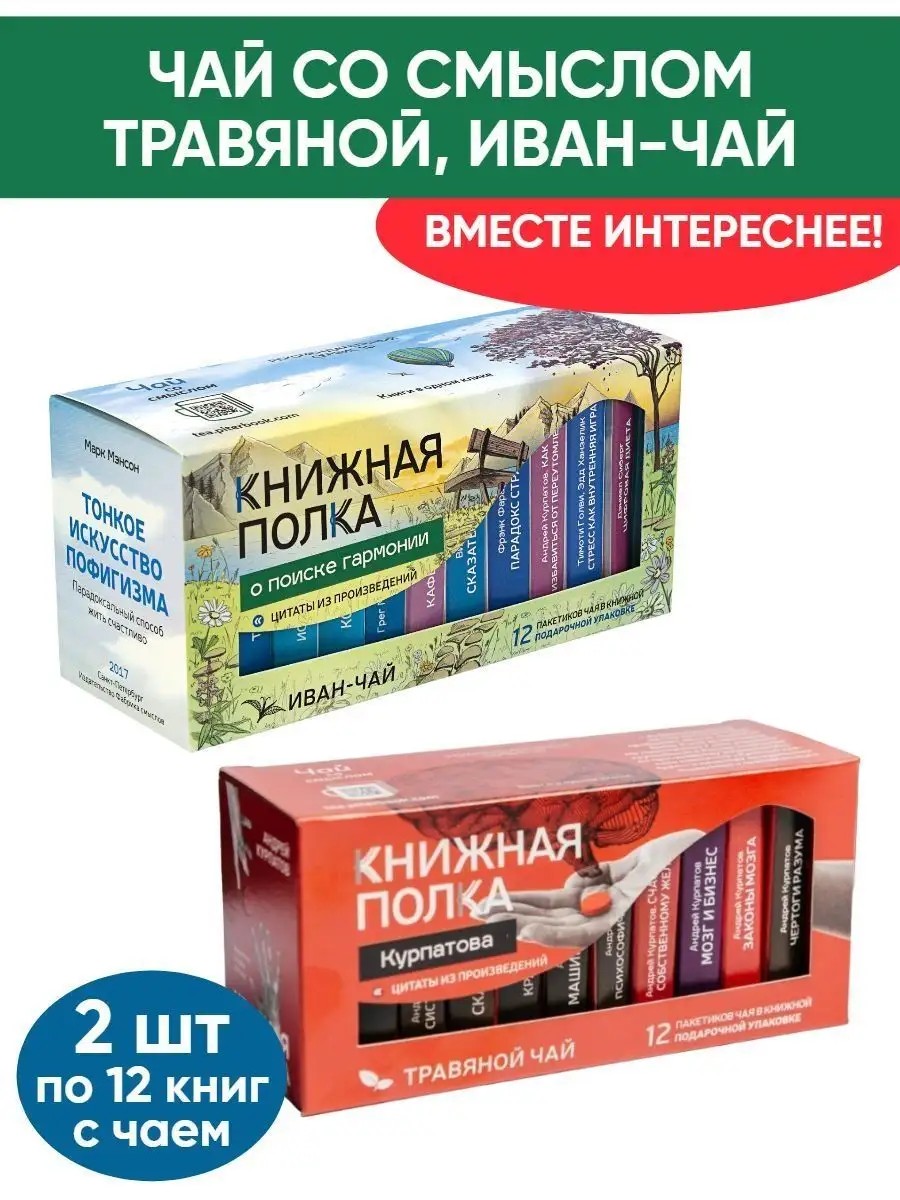 | Package contents | Books in a pack of tea "Kurpatov's Bookshelf", herbal tea - 1 pack (12 bags with mini-books); Books in a pack of tea "Bookshelf On the Search for Harmony", Ivan tea - 1 pack (12 bags with mini-books) |