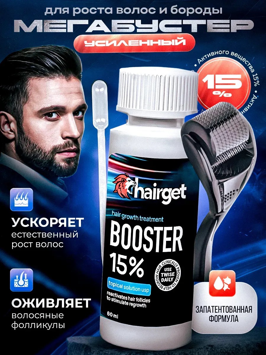Бустер Hairget 15% + мезороллер + пипетка - это эффективное средство для активного роста волос, обеспечивающее питание волосяных луковиц и стимулирующее кровоток в коже. Hairget 15% помогает отрастить густую бороду, усы или бакенбарды. Лосьон Hairget начинает работать сразу после нанесения на кожу головы или лица. Все фолликулы, находящиеся в состоянии покоя, переходят в цикл роста, благодаря чему растут новые волосы. Концентрат бустер для роста волос Hairget — это верный спутник на пути к густым и крепким волосам бороды, которая подчеркивает Вашу брутальность и индивидуальность. Hairget 15% стимулирует рост волос, улучшая кровообращение в фолликулах, что приводит к заметному улучшению плотности и толщины волос, стимулируя рост бороды (уход за бородой). Лосьон Hairget синоксидин 15% является уникальным косметическим средством, способствующим стимуляции роста мужских и женских волос. Работает лучше чем сыворотка для волос, никотиновая кислота для волос. Подарите полезный мужской подарок мужу, сыну, брату, отцу, папе, дяде, парню, мужчине на день рождения! Как правильно использовать Hairget 15% или 5%? Лосьон должен наноситься на чистый и высушенный участок кожи, будь-то на голове или на бороде. Его необходимо применять два раза в день на регулярной основе. Легкими движениями он втирается на желаемой для роста волос зоне. Для разового применения используется только одна доза в виде 1 мл раствора. Масло для бороды Hairget (для роста бороды и волос) не содержит синоксидин . Подходит против выпадения волос и для бороды и усов. Не является лекарственным средством!!