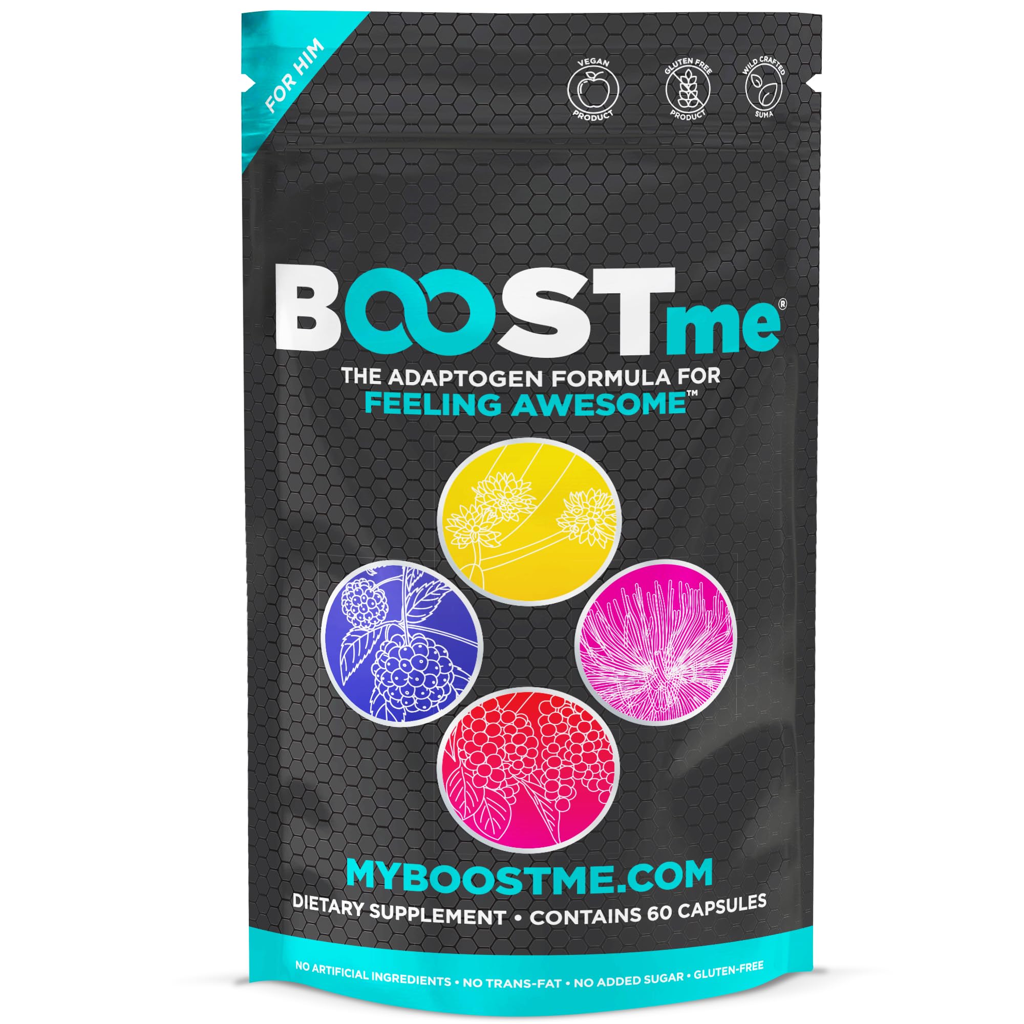 DESIGNED FOR MODERN MEN - A daily wellness supplement inspired by traditional herbal practices and made to support balance, vitality, and overall well-being. EASY-TO-TAKE CAPSULES - Convenient capsule format fits seamlessly into your daily routine at home, at work, or while traveling. CLEAN SIMPLE FORMULA - Made without artificial colors, fillers, or unnecessary additives. Crafted for those who prefer clean, plant-based supplementation. SUPPORTS FOCUS DAILY PERFORMANCE - Created to support attention, productivity, and daily momentum—ideal for busy routines, workdays, and physical activity. SUPPORTS NATURAL ENERGY LEVELS - Designed to complement active lifestyles, this adaptogen supplement helps support consistent energy throughout the day without stimulants. WILD-CRAFTED BOTANICAL BLEND - Formulated with Suma Root, Schisandra Berry, Golden Root (Rhodiola Rosea), and Siberian Ginseng—herbs traditionally used to support vitality, endurance, and everyday performance. DAILY ADAPTOGEN SUPPORT FOR MEN - BOOSTme Optimal Vitality for Him is a thoughtfully crafted adaptogen blend designed to support daily energy, balance, and overall wellness using traditional plant-based ingredients.