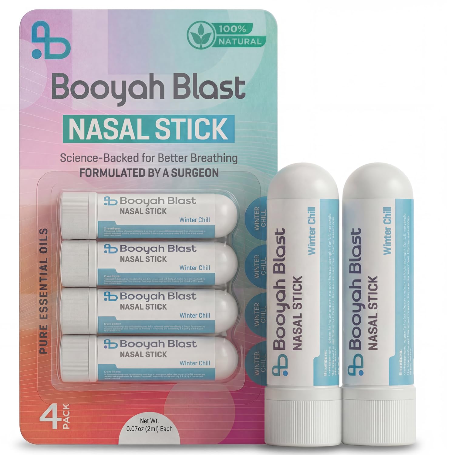 4 x Booyah Blast Winter ChillNAUSEA, MEET YOUR MATCH - Whether it's from scrolling your phone in the backseat or catching a bumpy ride, sudden motion sickness can ruin the vibe. But with Booyah Blast in your pocket, nausea stays in check, so you can stay focused, calm, and on the move. Winter Chill might just be the Flavor or your moment. Use as needed for mental clarity, meditation, wind down, cold season relief, or anytime you just need a break. "POCKET-SIZED FOR ON-THE-GO – These sleek menthol inhalers are your perfect companion, small enough to slip into your pocket or bag for daily Booyah Boost sessions. It's your morning ritual, desk drawer lifesaver, workout companion, travel buddy, rave essentials – your anytime, anywhere aromatic reset. ". BACKED BY SCIENCE TO ENHANCE BREATHING - Designed to open airways fast and restore natural breathing. Our inhaler sticks supports nasal airflow during allergy season, colds, and anytime you need to feel sharp, clear, and in control. RESET WITH THE "BOOYAH BOOST" FOR AN INSTANT SHIFT – and enjoy long-lasting freshness - our cooling menthol vapors stay potent for up to 180 days after opening, thanks to our proprietary Fragrance-Locking technology and a 5-day slow-soaking, vacuum air-drying process. NATURAL, CLEAN, DOCTOR-FORMULATED – Created by a leading ENT surgeon, Booyah Blast menthol inhalers deliver the refreshing power of pure essential oils to elevate your day - instantly and naturally. "100 NATURAL PORTABLE AROMATHERAPY FOR FOCUS, CLARITY AND CALM – Made with pure essential oils, our nasal inhaler sticks feature four potent blends to boost focus, ease stress and energize your mind - perfect for work, travel, or daily resets.".