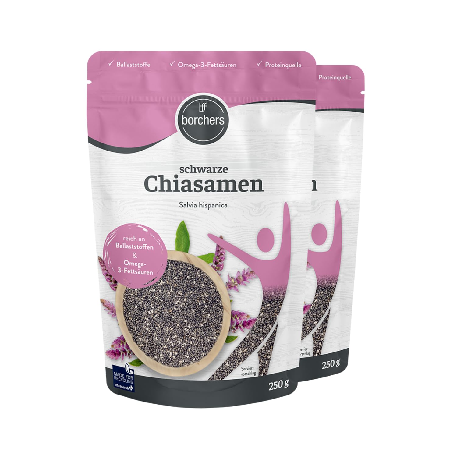 Chia seeds offer a delightful and subtle nutty flavor. They are also low in sugar and contain valuable omega-3 fatty acids, fiber, and protein. - 17 omega-3 fatty acids - low in sugar high in fiber - good swelling capacity - versatile: topping, baking, cooking. Chia seeds are incredibly versatile: mixed with milk, water, or plant-based milk, they can be used to make a delicious chia pudding thanks to their excellent swelling capacity. They are also perfect as an ingredient in hot dishes, such as lightly toasted on roasts, fish, and salads, or even in sweet dishes, cakes, and bread. Furthermore, they are a valuable addition to porridge, cereals, cottage cheese, yogurt, or smoothies. A healthy lifestyle and a varied, balanced diet are important for your health. INGREDIENTS Black chia seeds (Salvia Hispanica) INSTRUCTIONS FOR USE In accordance with Novel Food Regulations (EC) No. 258 97 and 2013 50 EU, the daily intake of 15g per person must not be exceeded. SAFETY WARNING Store in a cool, dry place. May contain traces of soy and nuts. MANUFACTURER'S DETAILS Manufactured for: borchers fine food GmbH Co. KG, Rosa-Luxemburg-Straße 3, 28876 Oyten, Germany See more Chia seeds offer a delightful and subtle nutty flavor. They are also low in sugar and contain valuable omega-3 fatty acids, fiber, and protein. - 17 omega-3 fatty acids - low in sugar high in fiber - good swelling capacity - versatile: topping, baking, cooking. Chia seeds are incredibly versatile: mixed with milk, water, or plant-based milk, they can be used to make a delicious chia pudding thanks to their excellent swelling capacity. They are also perfect as an ingredient in hot dishes, such as lightly toasted on roasts, fish, and salads, or even in sweet dishes, cakes, and bread. Furthermore, they are a valuable addition to porridge, cereals, cottage cheese, yogurt, or smoothies. A healthy lifestyle and a varied, balanced diet are important for your health. INGREDIENTS Black chia seeds (Salvia Hispanica) INSTRUCTIONS FOR USE In accordance with Novel Food Regulations (EC) No. 258 97 and 2013 50 EU, the daily intake of 15g per person must not be exceeded. SAFETY WARNING Store in a cool, dry place. May contain traces of soy and nuts. MANUFACTURER'S DETAILS Manufactured for: borchers fine food GmbH Co. KG, Rosa-Luxemburg-Straße 3, 28876 Oyten, Germany See moreBORCHERS Graines de chia noir, 2 x 250 g, haute capacité de gonflement, riches en fibres, source de protéines, acides gras oméga-3, pauvres en sucre, végétaliens, idéales pour la préparation de pâtes 250 g (2er Pack)DESCRIPTION DU PRODUIT DESCRIPTION DU PRODUIT Les graines de chia vous gâtent avec un goût de noisette très agréable et discret. En outre, ils sont pauvres en sucre et contiennent de précieux acides gras oméga-3, des fibres et des protéines. - 17 d'acides gras oméga-3 - faible en sucre riche en fibres - bonne capacité de gonflement - polyvalent : topping, pâtisserie, cuisson Les graines de chia peuvent être utilisées de manière très polyvalente : mélangées dans du lait, de l'eau ou de la boisson végétale, vous pouvez préparer les graines comme un délicieux pudding de chia grâce à leur bonne capacité de gonflement. Ils sont également parfaits comme ingrédient dans les plats chauds, comme légèrement rôtis dans les rôtis, sur le poisson et la salade ou même dans les plats sucrés, les gâteaux et le pain. En outre, ils sont un atout précieux dans la bouillie, les céréales, le fromage cottage, le yaourt ou les smoothies. Un mode de vie sain ainsi qu'une alimentation variée et équilibrée sont importantes pour votre santé. INGRÉDIENTS Graines de chia noir (Salvia Hispanica) MODE D'EMPLOI Conformément aux normes Novel Food VO (CE) n 258 97 et 2013 50 UE, la consommation quotidienne de 15 g par personne ne doit pas être dépassée AVERTISSEMENT DE SÉCURITÉ Conserver dans un endroit sec et à l'abri de la chaleur. Peut contenir des traces de soja et de fruits à coque. COORDONNÉES DU FABRICANT Fabriqué pour : borchers fine food GmbH Co. KG, Rosa-Luxemburg-Straße 3, 28876 Oyten Voir plusDÉTAILS : vous trouverez d'autres détails du produit et des conseils d'utilisation ci-dessous dans la description du produit. Expérience depuis 2005 : la marque borchers est synonyme de près de 20 ans d'expérience et de passion dans le développement d'alternatives au sucre et d'autres produits – pour tous ceux qui veulent profiter consciemment. ✓ Testé et rempli en Allemagne : nos produits borchers sont testés en Allemagne et emballés pour vous selon les normes de qualité les plus élevées. Convient bien aux plats : délicieux dans les frites, sur le poisson ou les salades. Convient pour la cuisson : garde le pain et les pâtisseries juteux et riches en nutriments. Goût : les graines de chia vous gâtent avec un goût de noisette doux très agréable. Utilisation polyvalente : idéal pour les céréales, le yaourt, le porridge ou les smoothies. HAUTE CAPACITÉ DE SOURCE : ils sont parfaits pour le pudding chia et les consistances crémeuses.