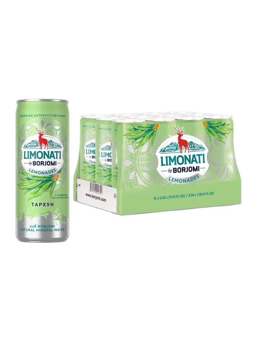 Borjomi Tarragon Carbonated Drink, 330 ml. Georgian lemonade Limonati by Borjomi Tarragon. A new product from the legendary brand with a 130-year history. A carbonated soft drink with natural herbal extract based on Borjomi mineral water. The soft herbal aroma of tarragon, fruity notes, and salty tint of the legendary Georgian water give the lemonade a bright, unique taste. No preservatives or artificial colors. Try real Georgian lemonades from Borjomi and immerse yourself in the atmosphere of sunny Georgia! Volume: 0.33 liters. Packaging type: tin can. Storage conditions: temperature from 0 to 25°C. Country of origin: Georgia.
