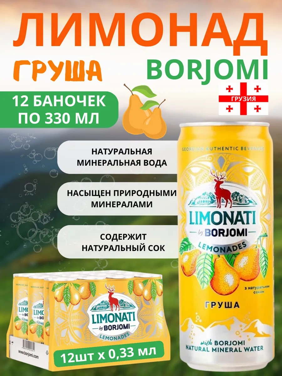 Откройте для себя лимонад Боржоми — легендарную минеральную воду с соком из сердца Грузии! Наша газированная минеральная вода с соком груши Borjomi в стильных жестяных банках объемом 0,33 л — это не просто напиток, а природный источник здоровья с более чем 150-летней историей. Каждая баночка сохраняет уникальный состав и свежесть сладкой минералки из знаменитых источников Кавказа.Почему выбирают Боржоми в банке 330 мл?