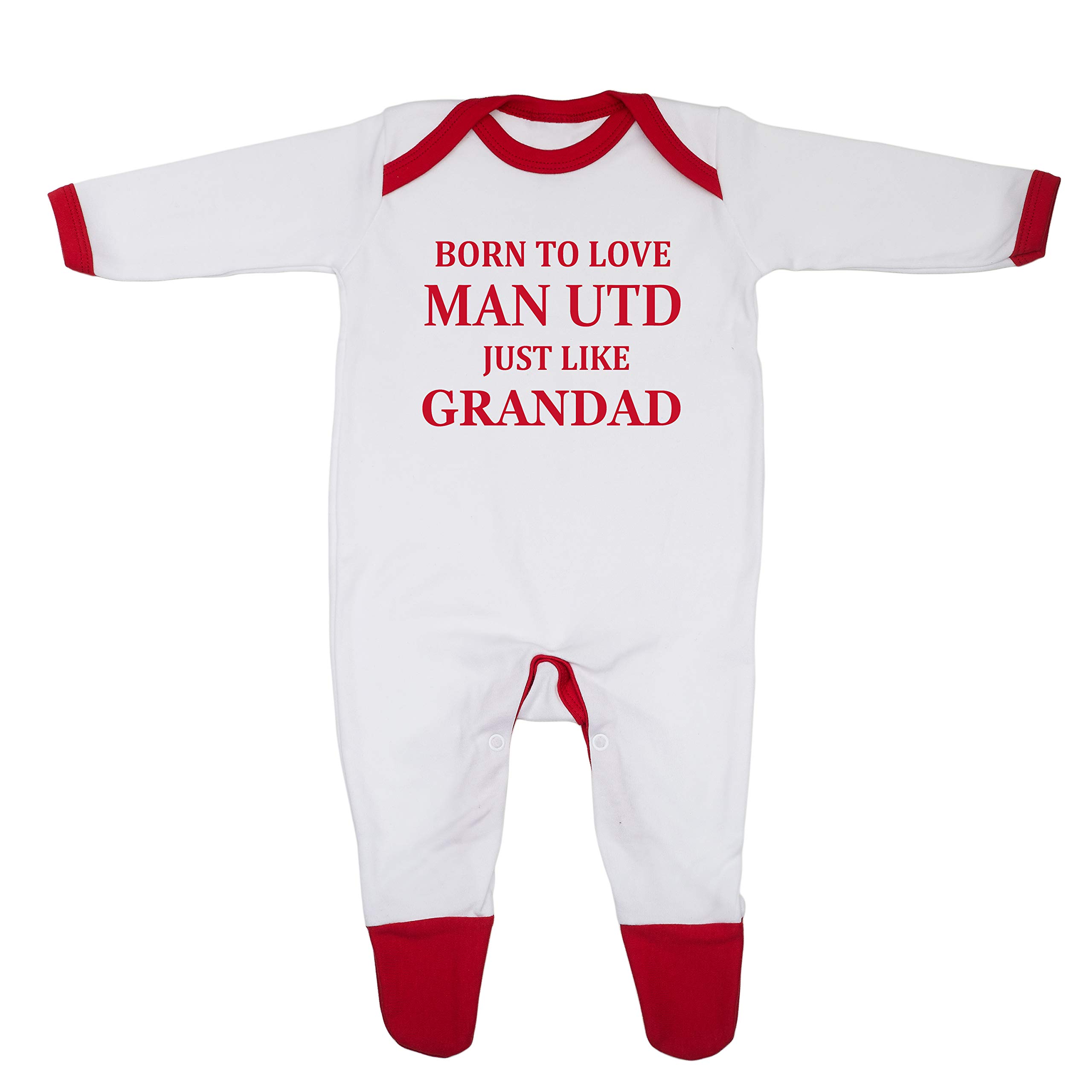 'Born To Love Man Utd Just Like Grandad' Baby Boy Girl Sleepsuit Designed and Printed in the UK Using 100% Fine Combed Cotton 6-9 Months White/Red Trim