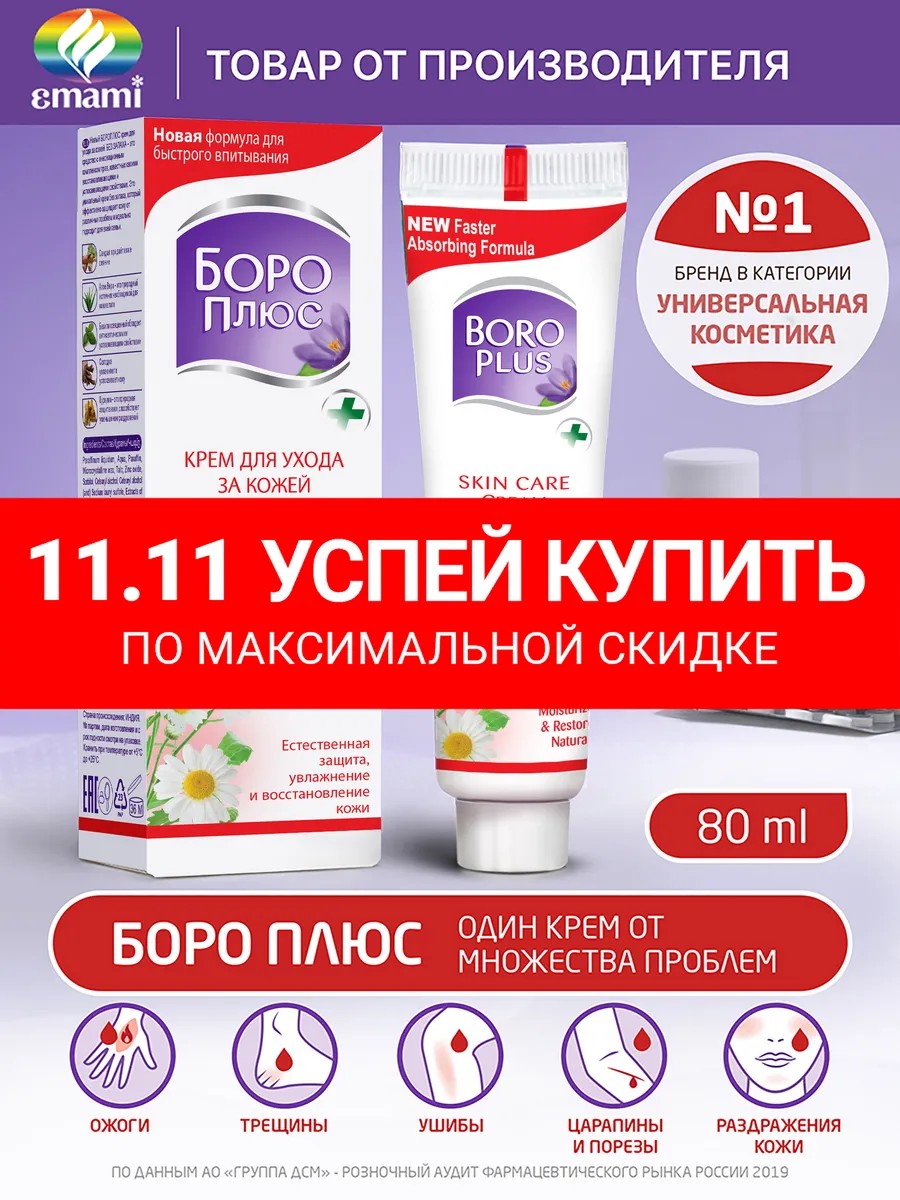 Крем для лица, рук и тела Боро плюс – уходовое средство с интенсивным восстанавливающим, смягчающим и регенерирующим действием! Косметика для чувствительной кожи известного бренда имеет комплексный питающий состав с натуральными компонентами, подобранными для Вашей красоты и здоровья. Косметическое средство без запаха с противовоспалительным, успокаивающим и антисептическим эффектом помогает снять раздражение и способствует быстрому восстановлению кожи, заживлению ран от порезов, ожогов и трещин. Это хороший выбор для восстановления и укрепления дермы после долгого пребывания на морозе или прогулок под солнцем. Универсальная лечебная формула с кремовой текстурой включает солодку и алоэ вера, которые увлажняют и питают эпидермис. Масло гарцинии помогает бороться против пигментных пятен и способствует заживлению рубцов. Несмываемый крем с антисептическим и бактерицидным эффектом подойдет для жирной, сухой и проблемной коже и зоны вокруг глаз. Это хороший выбор для взрослых женщин и мужчин со зрелой кожей, молодых девушек и парней или девочек - подростков. Профессиональная защитная чудо – формула с комплексом трав поможет в ежедневном уходе за новорожденным и точно пригодится для обработки ножек и ручек или шейки ребенка. Боро плюс станет секретом красоты и здоровья детского и возрастного эпидермиса. Состав с ингредиентами премиум – качества поможет снять ощущение сухости не забивая поры. Он подходит для применения утром или вечером и поможет защитить от последствий ветра и мороза, длительного прибывания в воде. Популярная смягчающая мазь поставляется в очень удобном тюбике объемом 25 и 50 или 80 мл. В нашем магазине вы найдете наборы из двух кремов Боро плюс разного объема. Формула обеспечит эффективный увлажняющий и смягчающий результат. Простое в использовании супер - средство можно использовать дома или брать с собой в поездки. Оно поможет снять зуд и раздражение после укусов насекомых. Боро Плюс регулярный крем, травяной, крем без запаха и СОФТ.