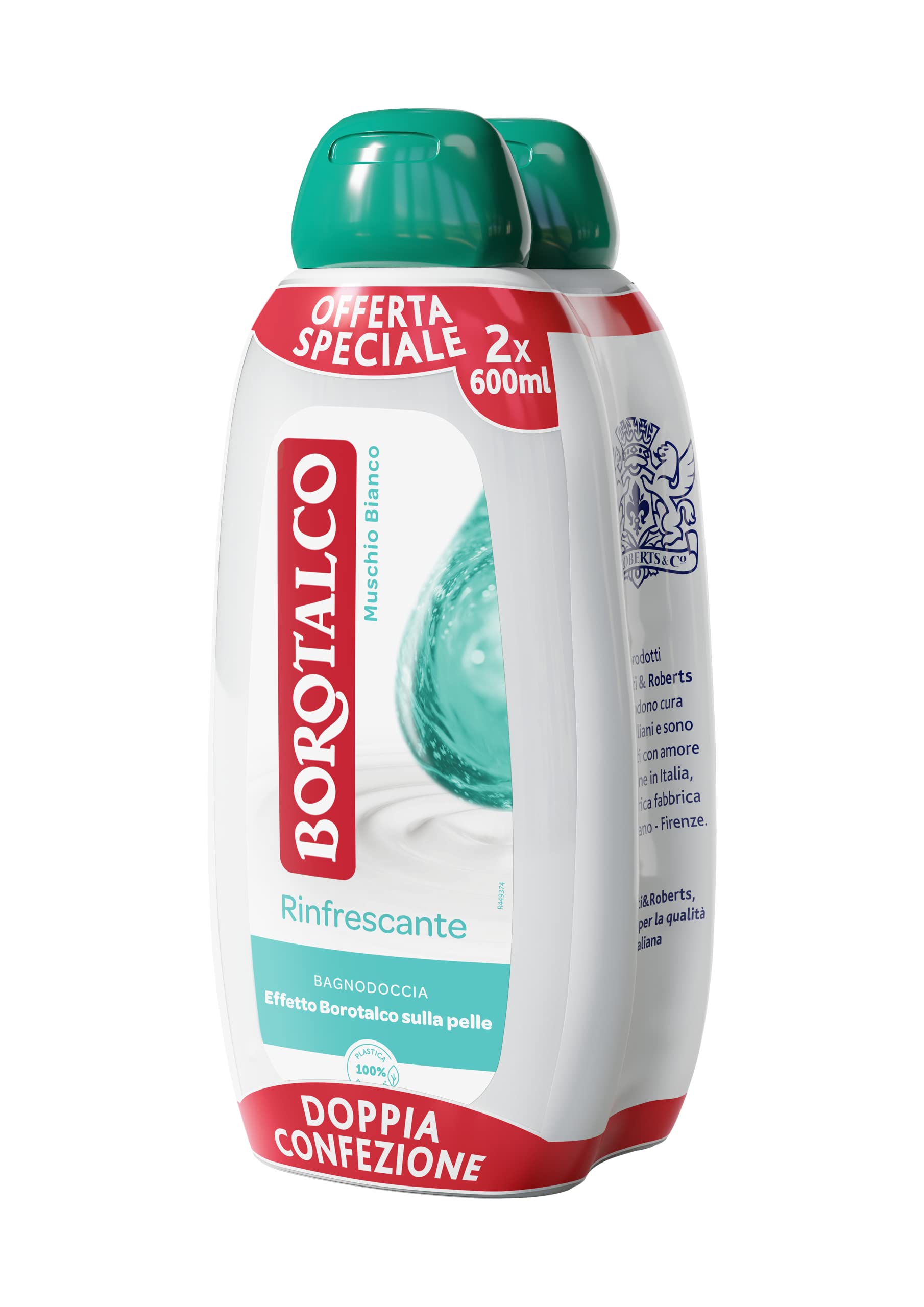 Borotalco's refreshing shower gel with white foam and the original Borotalco fragrance is ideal for refreshing your skin, leaving it soft, smooth, and velvety. Its refreshing formula features a delicate floral bouquet, enveloped by the softness of white musk, which combines with a talc base to create a simple, fresh, and clean scent. The refreshing foam moisturizes and refreshes the skin, respecting its natural pH. Dermatologically tested. Kind to skin and the planet, thanks to the recyclable bottle made from 100 recycled plastic. The iconic Borotalco fragrance signature is available in different evocative notes for a complete palette of emotional scents.Borotalco Baignoire rafraîchissante Musc Blanc, Humichissant Corpo, Fraicheur enveloppante, Effet borotalque sur la peau, dermatologiquement testé, 2 flacons de 600 mlDESCRIPTION DU PRODUIT Le bain de douche Borotalco rafraîchissant avec mousse blanche et parfum original de Borotalco est idéal pour donner fraîcheur à votre peau, en la laissant douce, lisse et veloutée. Sa formule rafraîchissante est due à un bouquet délicat fleuri, enveloppé par la douceur du Musc blanc qui s'associe à un fond talqué pour créer une note simple, fraîche et propre. La mousse rafraîchissante hydratée et rafraîchit la peau, respectant le ph naturel. Testé dermatologiquement. Gentile avec la peau et la planète, grâce au flacon recyclable en plastique 100 recyclé. L'iconique signature olfactive de Borotalco déclinée en différentes notes évocatives pour une palette complète de parfums émotionnels.La signature olfactive emblématique de Borotalco déclinée en différentes notes évocatives pour une palette complète de parfums émotionnels. Gentile avec la peau et la planète, grâce au flacon 100 recyclable en plastique recyclé. Un bouquet fleuri délicat enveloppé par la douceur du musc blanc s'associe à un fond talqué pour créer une note simple, fraîche et propre. Formule rafraîchissante en mousse blanche testée dermatologiquement pour une fraîcheur enveloppante. Bagage de douche Rafraîchissant avec parfum de mousse blanche, laisse votre peau douce, lisse et veloutée en vous donnant un effet Borotalco.