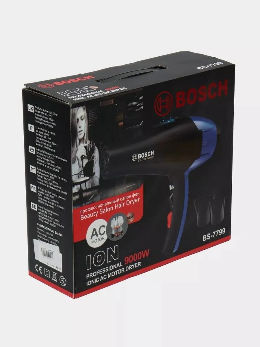 Фен BS-7799 отличается красивым дизайном и доступной ценой с большим набором функций. Отличается высоким качеством и надежностью, бережно сушит волосы. Это мощный и универсальный инструмент, с помощью которого можно не только высушить, но и аккуратно уложить ваши волосы. Фен BS-7799 мощный, при этом невероятно легкий прибор, станет важным аксессуаром в Вашем арсенале средств по уходу за волосами! Профессиональный фен Bosch BS-7799с функцией ионизации воздуха, специальным не скользящим покрытием корпуса и мощным температурно-скоростным воздушным потоком. Данный Фен имеет безупречный дизайн, легкий и компактный. Легкость фена одна из важных характеристик для длительной работы. Подойдёт как для парикмахеров так и для домашнего пользования. Фен BS-7799 с насадками оснащен новейшими технологиями: сетчатый съемный фильтр, мощный электрический двигатель, термостат, который защищает фен от перегревания. Долговечный. Данный Фен имеет безупречный дизайн, легкий и компактный. Легкость фена одна из важных характеристик для длительной работы. Подойдёт как для парикмахеров так и для домашнего пользования. Благодаря мощности в 9000 Вт, выходящий воздух нагревается практически мгновенно. Вы можете регулировать скорость потока воздуха и температуру нагрева. Функция "холодный воздух" поможет зафиксировать прическу. Покупая наш товар вы никак не пожалеете так как вы можете его дать в подарок маме, бабушке, жене и любимой а также дочери на новый год и день рождения можно и на новоселье и любой праздник и без поводов. Покупайте наш мега супер фен и даруйте радость вашим близким и родным
