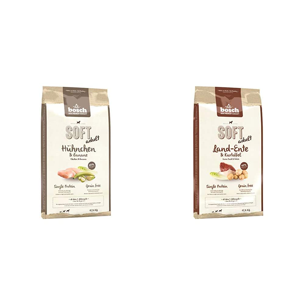 Bosch HPC soft chicken & banana,Half -moist dog food for adult dogs of all breedsSingle protein,Grain Free, 1 x 12.5 kg Osch soft+ chicken & banana is a single protein product for the balanced diet of adult dogs of all breeds.The high proportion of fresh chicken (min. 60 %) as the sole animal protein source gives the product an extraordinary protein quality.By using starchy banana (min. 8 %) as an important carbohydrate carrier, as well as highly digestible potato, Bosch Soft+ Chicken & Banana is completely grain -free.The higher moisture content (18 %) gives the croquette a soft consistency.Excellent as particularly tasty and digestible.Proportion of protein origin in the overall protein: 68.5 % Bosch HPC Soft Land duck & potato,Half -moist dog food for adult dogs of all breedsSingle protein,Grain Free, 1 x 12.5 kg Osch Soft+ Land-duck is a single protein product for the balanced diet of adult dogs of all breeds.Bosch Soft+ Land duck is particularly suitable for dogs that need a special taste experience for feeding feed.The high proportion of fresh land duck (min. 60 %) as the sole animal protein source and highly digestible potato as a carbohydrate source gently and of course grain-free.The soft croquette (18 % moist) makes Bosch Soft+ Land duck a special taste experience for your dog.Excellent as particularly tasty and digestible.Painting of animal origin in the overall protein: 66 %
