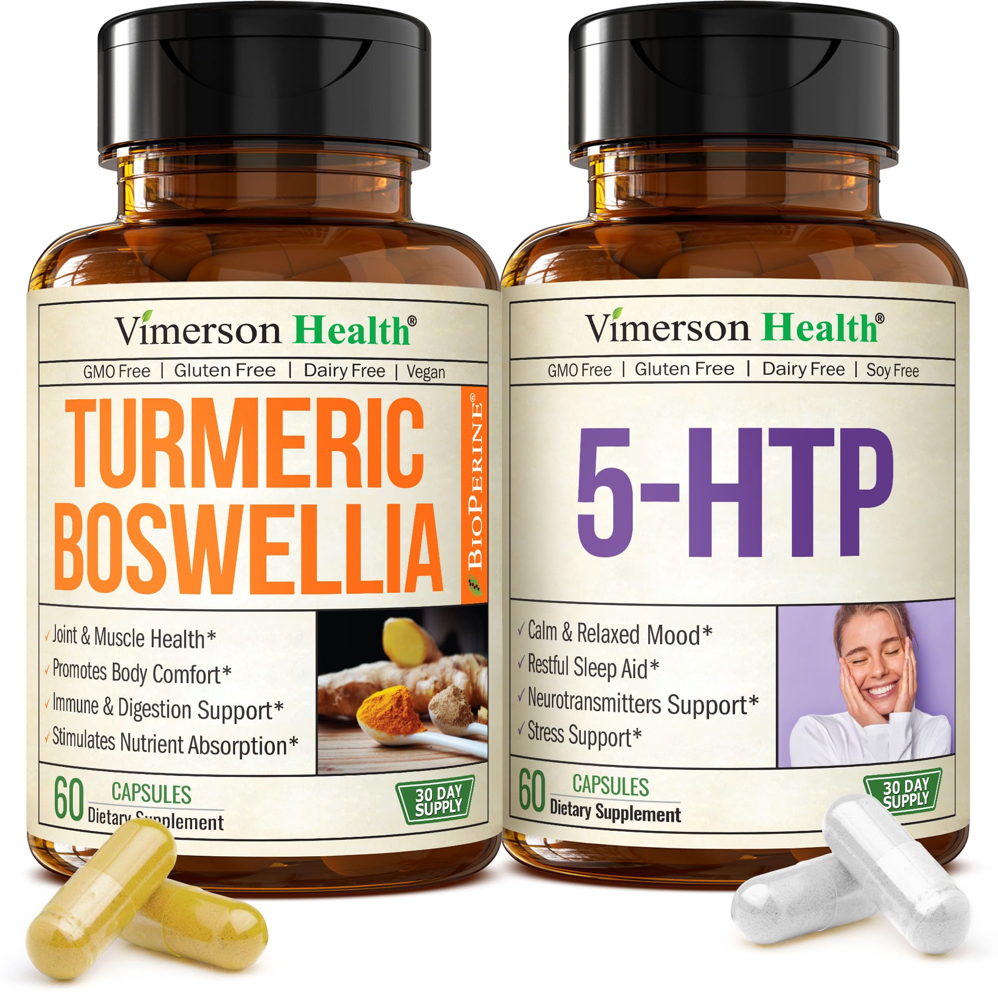 This premium 2-in-1 bundle combines the benefits of a clean, plant-based Turmeric Supplement with Boswellia Serrata, Ginger Root Curcumin with Black Pepper (95 Curcuminoids) and a potent 5-HTP Supplement with Calcium for sleep aid, mood support supplement, and daily vitality. Together, these formulas support joint health, mobility, digestion, relaxation, and a positive mindset for men and women. Each serving of the Tumeric Boswellia Supplement delivers standardized Boswellia Extract (65 Boswellic Acid), Organic Turmeric Powder, Curcumin with Black Pepper, and Ginger Root. This vegan joint support supplement helps maintain flexibility, mobility, and a healthy inflammatory response while supporting digestive balance and antioxidant defense. Popular as turmeric capsules, ginger root capsules, curcumin supplements, and boswellia serrata extract capsules, it remains a trusted choice among joint supplements for men and joint supplements for women seeking plant-based comfort. Complementing joint care, our 5-HTP supplement provides 200 mg of 5htp naturally derived from Griffonia seeds, combined with 328 mg Calcium to promote serotonin production and support the body's natural synthesis of melatonin and GABA. This powerful sleep supplement encourages relaxation, healthy neurotransmitter function, and stress balance. Customers use it as sleep aids, dopamine supplements, or serotonin supplements for women to help maintain restful nights and a calm mood. Both formulas are Non-GMO, Gluten Free, Soy Free, Dairy Free, and made in the USA in a cGMP-certified facility with globally sourced ingredients. This convenient bundle offers turmeric and ginger supplements plus 5-htp supplements in one trusted package for daily use. Includes 60 Turmeric Boswellia Capsules and 60 5-HTP 200mg Capsules – a complete solution for joint support, sleep calm, stress supplements, and serotonin and dopamine supplements to help you feel and move your best every day.HOW TO USE – Take 2 capsules of each supplement daily with food. If sensitive, start with 1 capsule. Designed for daily use to support joint health energy, immunity, and long-term vitality. Use consistently for best results. Some may notice results in 30-60 days. . PREMIUM QUALITY YOU CAN TRUST – Made in the USA with high quality global ingredients, in a cGMP-certified facility. Third-party tested for purity and potency. Non-GMO, gluten free, soy free, and nut free. . DUAL FORMULA FOR BETTER SLEEP. 5 HTP (200 mg) Supplement plus Calcium. Boosted formula with 328mg Calcium - a key mineral needed to support the body's production of Melatonin GABA - chemical messengers Essential for Restful Sleep, Relaxation Calm. . BALANCES INFLAMMATION NATURALLY - This Turmeric Curcumin Supplement supports inflammation balance and digestive health. Use consistently to experience lasting comfort and easier movement over time. . UNLEASH A POSITIVE STATE OF MIND. Lift your Mood with our Potent 5 HTP Supplement. An Amino Acid that converts into Serotonin - the "feel-good" neurotransmitter. Promotes a Relaxed and Positive Mood. . POWERFUL JOINT SUPPORT SUPPLEMENT – A premium Turmeric Supplement with Boswellia Extract, and Ginger Root to support healthy joints, mobility, flexibility. Formulated with ingredients known to be gentle on the stomach. . JOINT HEALTH SUPPORT SLEEP AID – 2-in-1 bundle combining Boswellia Turmeric Supplement and 5HTP Serotonin Supplements. .