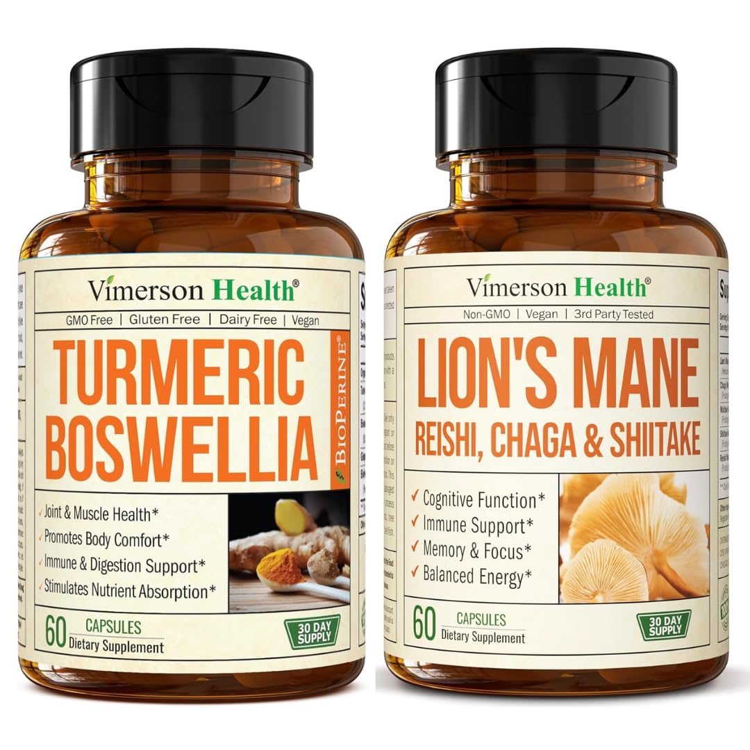 Unlock Daily Clarity Joint Strength with Turmeric Boswellia Lion's Mane Complex — your complete bundle for mobility, focus, and immune support. This premium 2-in-1 set combines the joint-comforting benefits of Turmeric Curcumin Supplement with Boswellia Serrata and the cognitive-boosting power of Lion's Mane Mushroom, creating a balanced solution for mind and body wellness. The Turmeric Boswellia formula delivers Organic Turmeric, Curcumin with Black Pepper, Ginger Root, and Boswellia Serrata, known for promoting joint support, mobility, and digestive health. Enhanced with BioPerine for superior absorption — ideal for adults seeking a natural anti inflammatory supplement for active living. The Lion's Mane Complex brings together a powerful blend of Mushrooms including Lion's Mane, Reishi, Turkey Tail, Chaga, Shiitake, and Maitake Mushrooms. This advanced mushroom supplement supports brain health, focus, memory, and energy balance while strengthening the immune system. Designed as Lion's Mane supplement capsules, it provides clean, consistent support for mental clarity, cognitive performance, and immune defense, without caffeine or stimulants. Turmeric and Boswellia promote joint health, comfort, and mobility Lion's Mane and Reishi Mushroom Capsules enhance focus, memory, and immune support Chaga Mushrooms and Turkey Tail Mushroom Capsules contribute antioxidant protection Ginger Root and Curcumin Supplements help maintain gut and digestive health This herbal supplements duo supports brain and body balance, perfect for professionals, athletes, or anyone seeking sustained energy, mobility, and focus. Customers searching for mushroom complex, lions mane mushroom, brain supplements for memory and focus, or immune boosters for adults will find targeted benefits for everyday performance. Stay active, focused, and resilient with this trusted Turmeric Curcumin and Lion's Mane Supplement bundle — your natural path to joint comfort, mental clarity, and total wellness.HOW TO USE – Take 2 capsules of each supplement daily with food. If sensitive, start with 1 capsule. Designed for daily use to support joint health energy, immunity, and long-term vitality. Use consistently for best results. Some may notice results in 30-60 days. . PREMIUM QUALITY YOU CAN TRUST – Made in the USA with high quality global ingredients, in a cGMP-certified facility. Third-party tested for purity and potency. Non-GMO, vegan, sugar free, and heavy-metals tested. . TRIPLE MUSHROOM IMMUNE DEFENSE - Includes Maitake, Shiitake Reishi Mushroom Extract - selected for their immune-supportive properties. This powerful combination works together to reinforce your body's natural defenses and overall wellness. . ENHANCED ABSORPTION - Curcumin and Black Pepper to support inflammation balance, wellness, and vitality. . MEMORY SUPPORT FOR AGING ADULTS - Designed to support memory retention and focus, this blend features Lion's Mane and Shiitake mushrooms - known for their cognitive support properties. Ideal for adults seeking a plant-based way to stay alert and sharp as they age. . BALANCES INFLAMMATION NATURALLY - This Turmeric Curcumin Supplement supports inflammation balance and digestive health. Use consistently to experience lasting comfort and easier movement over time. . ADVANCED COGNITIVE MOOD SUPPORT - Packed with 1000 mg Lion's Mane Extract, this adaptogenic mushroom supports mental clarity, cognitive performance, and a balanced mood. Combined with Chaga for antioxidant support, it helps you stay focused and mentally sharp. This 5-mushroom complex also includes Reishi, Shiitake, and Maitake for added immune and cognitive support. . POWERFUL JOINT SUPPORT SUPPLEMENT – A premium Turmeric Supplement with Boswellia Extract, and Ginger Root to support healthy joints, mobility, flexibility. Formulated with ingredients known to be gentle on the stomach. . JOINT HEALTH MOOD IMMUNE SUPPORT – 2-in-1 bundle combining Boswellia Turmeric Supplement and Lions Mane Supplement Capsules. .