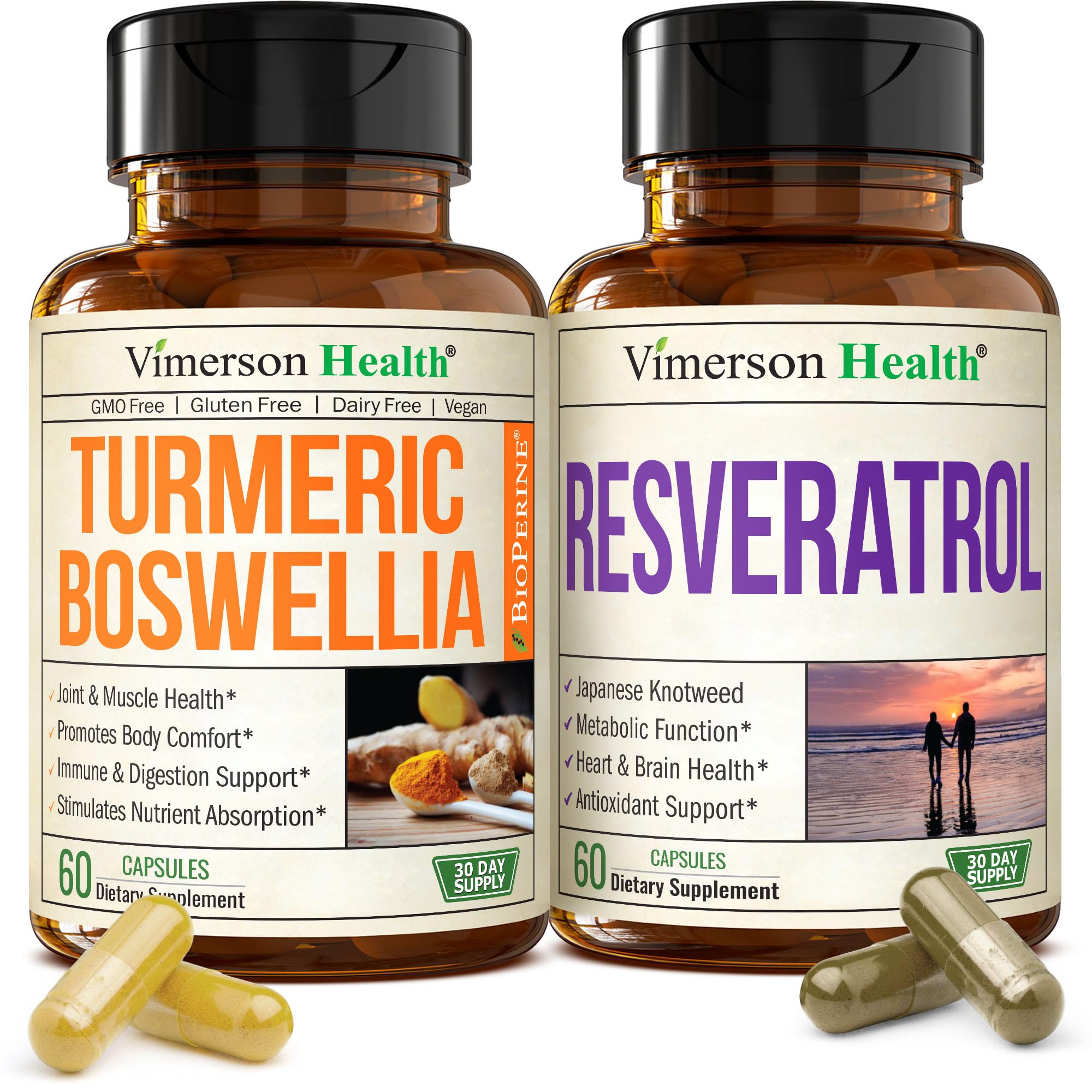 Unlock Complete Wellness with Joint, Heart Cellular Support Experience the powerful synergy of two science-backed formulas — Turmeric Boswellia and Resveratrol Japanese Knotweed capsules — designed to promote long-term vitality, flexibility, and healthy aging. This premium bundle delivers the combined benefits of turmeric curcumin supplement for joint comfort and resveratrol supplement for cardiovascular and antioxidant protection. Together, they support balanced inflammation, joint mobility, and cellular renewal for whole-body wellness. The Turmeric Boswellia formula features organic turmeric, Boswellia serrata, ginger root, and black pepper extract (BioPerine) for enhanced absorption. Trusted as an anti inflammatory supplement, it promotes joint flexibility, digestive balance, and immune defense while helping manage occasional discomfort after physical activity. Complementing it, our Japanese Knotweed resveratrol complex delivers 1000 mg Japanese knotweed extract, grape seed extract, green tea extract, and quercetin—a rich blend of antioxidants that help fight free radicals, promote cardiovascular support, and encourage healthy aging and longevity. This resveratrol supplement helps maintain healthy circulation and cellular integrity while supporting energy and endurance at every age. Perfect for active adults and wellness-focused individuals, this duo is your foundation for balanced joint support, immune health, and heart vitality. Whether you're seeking resveratrol 1000mg, organic resveratrol supplement, or a trusted turmeric curcumin supplement, this combination delivers results you can feel — from improved mobility to sustained daily energy. Both formulas are Non-GMO, vegan, and gluten-free, crafted in the USA in cGMP-certified facilities and third-party tested for purity and potency. Reclaim your vitality with this Turmeric Boswellia Resveratrol bundle — the perfect daily combination for joint comfort, cardiovascular resilience, and graceful aging.PREMIUM QUALITY YOU CAN TRUST – Made in the USA with high quality global ingredients, in a cGMP-certified facility. Third-party tested for purity and potency. Non-GMO, vegan, gluten-free, dairy-free, sugar-free, and soy-free. . POTENT ANTIOXIDANT: Resveratrol is a Powerful Antioxidant. Helps protect your body from the harmful effects of free radicals. Supports Healthy Aging. This supplement contains a blend of Antioxidant ingredients. Japanese Knotweed Extract, Quercetin Dihydrate, and Green Tea Extract provide Comprehensive Antioxidant Support. . ENHANCED ABSORPTION - Curcumin and Black Pepper to support inflammation balance, wellness, and vitality. . CARDIOVASCULAR SUPPORT: Resveratrol is renowned for its ability to Support Heart Health. Promotes Blood Flow and Balances Inflammation. Our supplement also contains Grape Extract for extra Cardiovascular Support. Take control of your Cardiovascular Health and keep your heart ticking like a well-oiled machine. . BALANCES INFLAMMATION NATURALLY - This Turmeric Curcumin Supplement supports inflammation balance and digestive health. Use consistently to experience lasting comfort and easier movement over time. . SUPPORTS HEALTHY AGING: Formulated with Japanese Knotweed Extract. Your secret weapon against the Effects of Aging. A Potent Source of Resveratrol. Supports Healthy Aging and Promotes Overall Wellbeing. Invest in your long-term health and feel Young and Healthy. . POWERFUL JOINT SUPPORT SUPPLEMENT – A premium Turmeric Supplement with Boswellia Extract, and Ginger Root to support healthy joints, mobility, flexibility. Formulated with ingredients known to be gentle on the stomach. . JOINT HEALTH CARDIOVASCULAR SUPPORT – 2-in-1 bundle combining Boswellia Turmeric Supplement and Japanese Knotweed Capsules. .