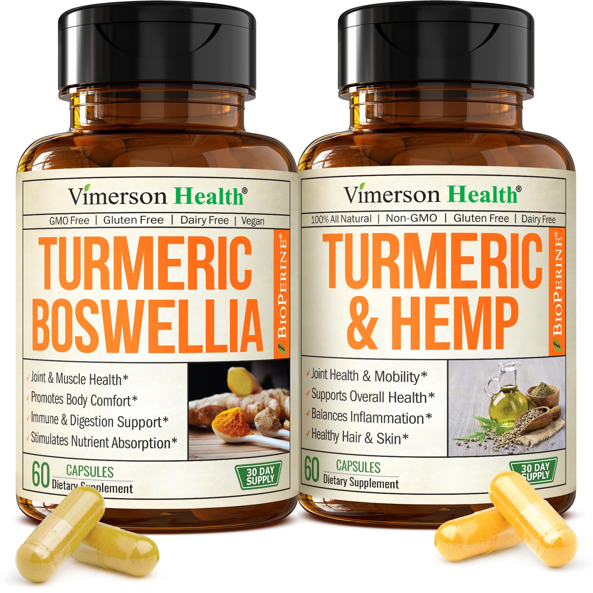 This unique 2-in-1 bundle combines the joint-supporting benefits of a premium Turmeric Supplement with Boswellia Serrata, Ginger Root Curcumin with Black Pepper (95 Curcuminoids) and the restorative balance of a Turmeric Curcumin Supplement with Lemon Balm and Hemp Seeds. Together, these clean, plant-based formulas deliver comprehensive support for joint health, mobility, inflammation balance, relaxation, and daily vitality. Each serving of the Tumeric Boswellia Supplement provides standardized Boswellia Extract (65 Boswellic Acid), Organic Turmeric Powder, Curcumin with Black Pepper, and Ginger Root. This vegan joint support supplement promotes flexibility, mobility, and digestive wellness. Popular as turmeric capsules, curcumin supplements, ginger root capsules, and boswellia serrata extract capsules, it is trusted among joint supplements for men and joint supplements for women seeking a natural way to maintain active lifestyles. Complementing joint care, the Turmeric Hemp Supplement features Turmeric Extract (95 Curcuminoids), Lemon Balm Extract, and nutrient-rich Hemp Seeds. This advanced formula not only supports mobility but also promotes calm relaxation. Customers use it as a sleep supplement, or inflammation relief supplement, benefiting from the synergy of lemon balm extract, plant-based omegas, and turmeric with black pepper for enhanced absorption. Both formulas are Non-GMO, Gluten Free, Soy Free, Dairy Free, and manufactured in the USA in cGMP-certified facilities with globally sourced ingredients. Third-party tested for purity and potency, this bundle offers the combined strength of organic turmeric supplement, anti inflammatory supplements. Includes 60 Tumeric Boswellia Capsules and 60 Turmeric Hemp Capsules – a complete solution for joint support, inflammation relief, relaxation, and daily wellness in one convenient package.HOW TO USE – Take 2 capsules of each supplement daily with food. If sensitive, start with 1 capsule. Designed for daily use to support joint health energy, immunity, and long-term vitality. Use consistently for best results. Some may notice results in 30-60 days. . PREMIUM QUALITY YOU CAN TRUST – Made in the USA with high quality global ingredients, in a cGMP-certified facility. Third-party tested for purity and potency. Non-GMO, vegan, gluten free, soy free, and nut free. . ENHANCED ABSORPTION - Curcumin and Black Pepper to support inflammation balance, wellness, and vitality. . RESTFUL SLEEP SUPPORT - Hemp Lemon Balm encourage restful sleep, overnight recovery and steady daily energy. Gentle botanicals traditionally used as a natural sleep supplement. . BALANCES INFLAMMATION NATURALLY - This Turmeric Curcumin Supplement supports inflammation balance and digestive health. Use consistently to experience lasting comfort and easier movement over time. . CALM RELAXATION - Infused with Lemon Balm Extract (4:1), promotes calm focus. . POWERFUL JOINT SUPPORT SUPPLEMENT – A premium Turmeric Supplement with Boswellia Extract, and Ginger Root to support healthy joints, mobility, flexibility. Formulated with ingredients known to be gentle on the stomach. . JOINT HEALTH RESTFUL SLEEP SUPPORT – 2-in-1 bundle combining Boswellia Turmeric Supplement with Hemp Seeds Lemon Balm Extract. .