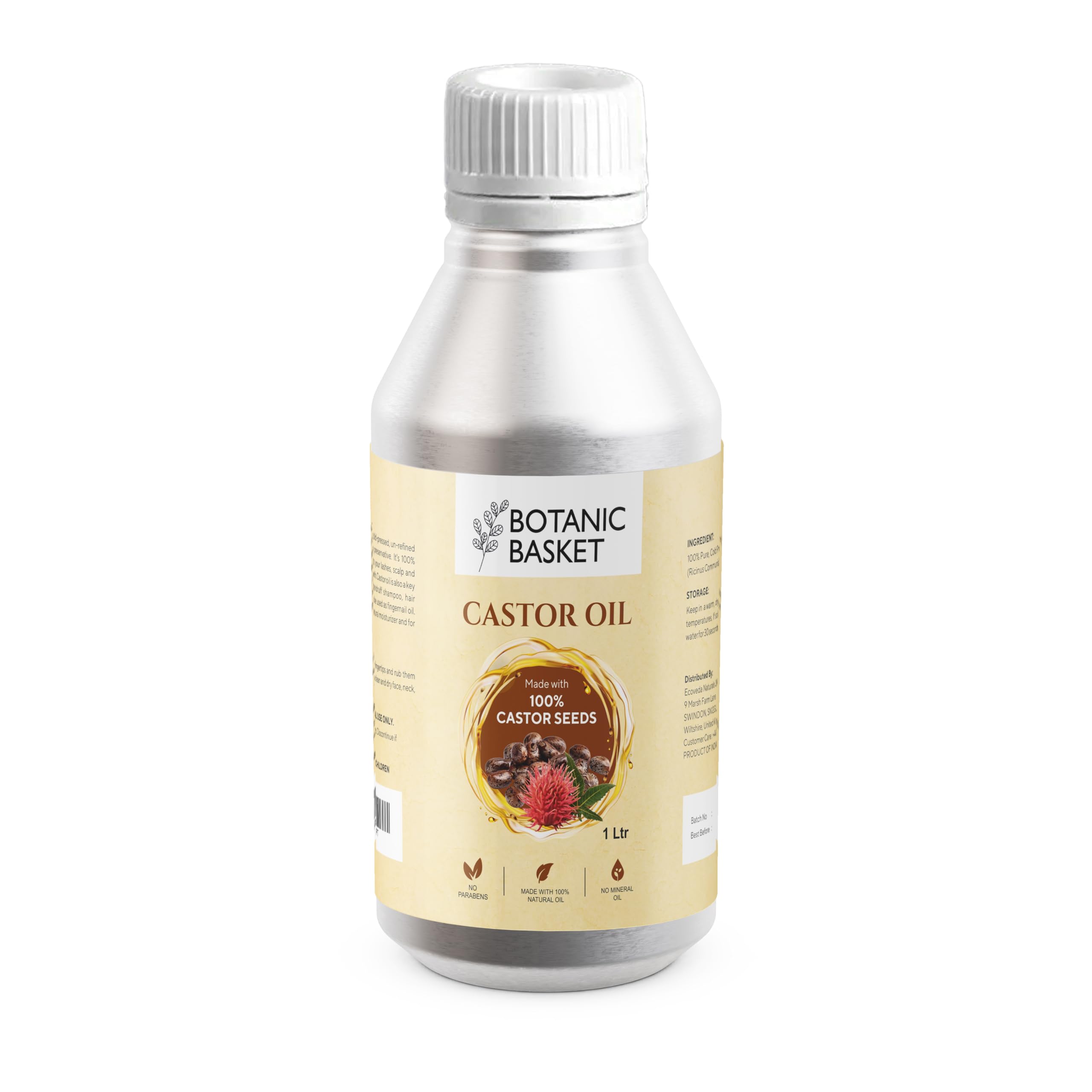 Botanic Basket Castor Oil 1 Litre 1000ml Cold Pressed & Freshly Squeezed 100% Pure & Undiluted Hexane Free for Eyebrows Nails Beard Hair Eyelashes Food Grade