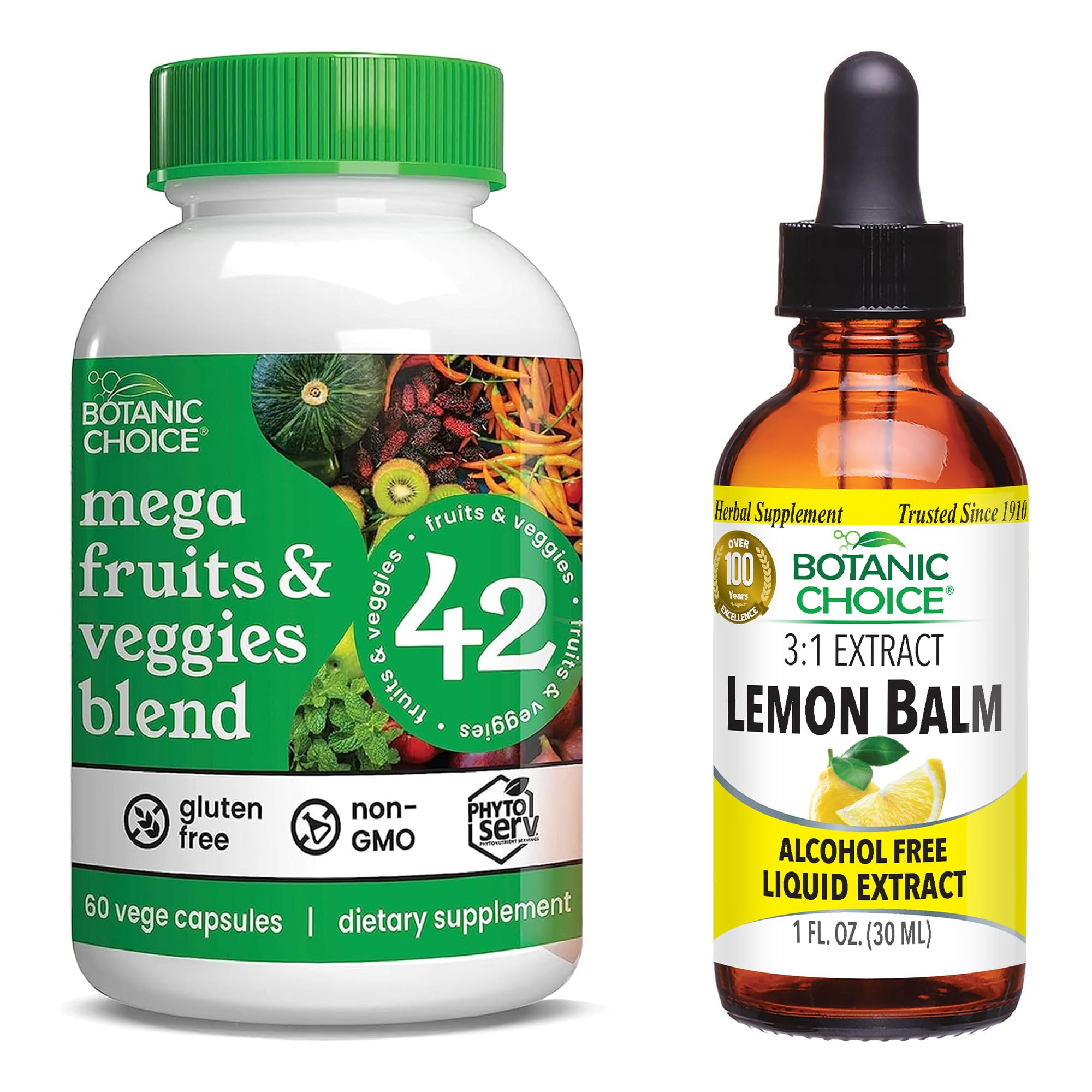 Botanic Choice Essential Formulas: Found in the orange labels, our essential line delivers a single or combination of classic vitamins, minerals, herbs or extracts. These time-tested nutrients offer a cost-effective option for just about every health need. Botanic Choice Exclusive Formulas: Found in the green labels and a step above our essential line, our Exclusive Formulas target each specific health concern. They are specially developed to deliver enhanced effectiveness by combining the right nutrients in the right dosages. Botanic Choice Premium Formulas: If you're looking for the best-of-the best, our Premium line delivers. Each Premium Formula offers highly-researched, innovative ingredients, often patented and clinically proven for superior results. Their gold labels reflect the quality that goes into their development and productionSuper Mood Boost – The alcohol-free and gluten-free lemon balm extract drop's soothing sensations make it easier to calm down, relax, and rejuvenate, so you can get back to feeling your best. Gentle Sleep - Lemon balm leaf liquid extract has strong properties that promote a balanced and restful sleep. Consistently using the right lemon balm tincture concentration formula helps support quality rest. Power-Packed - 42 different fruits and vegetables in one capsule more variety than other competitors. Each ingredient delivers a unique health benefit that supports overall well-being. Balance - Now it's simpler than ever to get important nutrient super greens with our amazing formula fruit and vegetable supplement. Each daily serving is full of antioxidants and nutrition in easy-to-swallow capsules. Naturally Good - Blueberry, cranberry, grapeseed, raspberry, pomegranate, bilberry, alfalfa, carrot, broccoli, apple, black cherry, celery, artichoke, spirulina, elderberry, spinach, tart cherry, papaya and more.