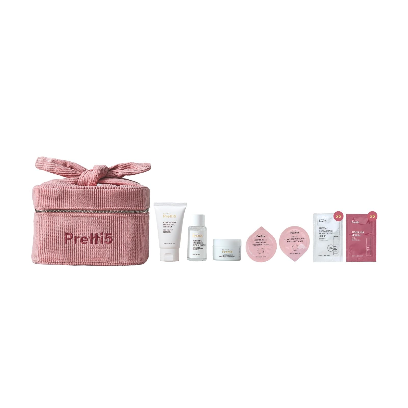 Product Included: Pretti5 corduroy travel bag 1 mini hydro-power brightening cleanser - 35g 1 mini purifying hydrating toning essence - 30ml 1 mini hydro-rescue repairing night mask - 25g 1 mini - ceramide hydrating treatment mask - 10g 1 mini - mt.fuji clay pore perfecting treatment mask - 10g 1 sachet - peony hyaluronic brightening serum - 2ml 5 sachet - timeless serum - 2ml 5. Safe for All Skin Types: Fragrance-Free, Mineral Oil-Free, Silicone-Free, Alcohol-Free, Vegan, and Cruelty-Free. Key Ingredient: Combines traditional herbal botanicals and advanced scientific actives e.g. Tranexamic Acid, Niacinamide, and Hyaluronic Acid to deliver a natural healthy glow. All-rounded Skincare Set: Deliver maximum benefits without overwhelming your skin from day to night, cleanse, nourish, renew, brighten, firm and strengthening your skin barrier.