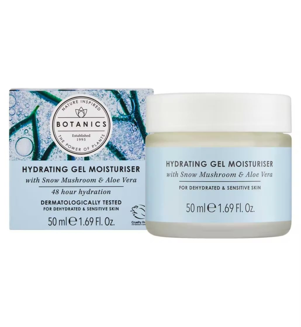 Contains Snow Mushroom, a plant powered alternative to Hyaluronic Acid. Known for its ability to replenish and lock in moisture. Contains Aloe Vera, Known for its ability to calm, soothe & hydrate. Dermatologically Tested Fragrance Free Vegan Formulation Non Comdogenic Cruelty Free No Paraben. Botanics ightweight gel moisturiser instantly provides an intense moisture boostthat hydrates skin for up to 48 hours after just one use. Skin is rehydrated and left looking healthy, smooth and plumped with moisture. Dermatologically Tested: This moisturiser has been dermatologically tested to ensure it is gentle and non-irritating. Suitable for All Skin Types: The gentle formula makes it suitable for use on all skin types, including sensitive skin. Botanics Range: Part of the Botanics range, this product is formulated with natural plant extracts and botanical ingredients. Botanics Hydrating Formula: This moisturiser is enriched with aloe vera and chamomile to provide soothing hydration for your skin.