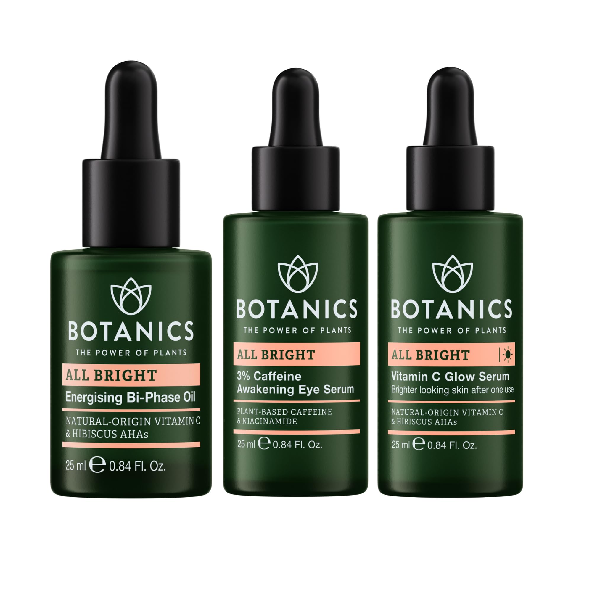25 Years of Plant-Powered Products - All Botanics products are formulated with honesty, integrity and transparency from ethically sourced and sustainable ingredients. This skin oil is no exception, and helps our team do more good for more people, plus our whole planet. Vitamin C Glow Serum - This brightening face serum is powered by natural-origin Vitamin C. It's specially formulated to deliver brighter, more even-looking skin after just one use. 3 Caffeine Eye Serum - We designed this beauty sleep in a bottle for dark circles and puffiness. It can help refresh and brighten the delicate skin around your eyes, and leave you ready to take on the day. Energizing Bi-Phase Facial Oil - Formulated with natural AHAs from hibiscus, this bi-phase facial oil can help brighten dull skin and improve the appearance of an uneven skin tone. Use it on its own, or as a brightening serum or face oil for gua sha. All Bright Trio - This bundle includes the hydrating Bi-Phase Oil, invigorating 3 Caffeine Eye Serum and brightening Vitamin C Glow Serum for your most radiant complexion.