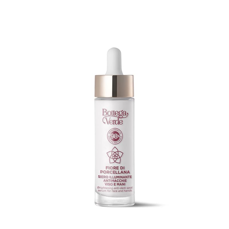 A brightening and illuminating concentrate for the face and hands, with enhanced anti-dark spot action. It acts directly on dark spots and skin discoloration caused by aging, sun exposure, pregnancy, or hormonal imbalances. It combines the action of porcelain flower extract with Cybright, an active ingredient with an extraordinary ability to improve the problem of dark spots on multiple levels. The result is a serum with proven efficacy that, in addition to brightening dark spots, prevents their reappearance and provides a uniform and radiant complexion. Ideal for all skin types and all types of dark spots. 98 Naturally Derived Ingredients. Vegan Formula. Your Youth Defense Treatment: Corrects and prevents the appearance of dark spots. Effective for the targeted treatment of major skin dyschromia. Evens skin tone and brightens. -53 Spot Color. Instrumental test on 30 women, 12 weeks, 97 of volunteers with a positive result. -38 Spot Intensity. Dermatological clinical test on 30 women, 12 weeks, 93 of volunteers with a positive result. SAFETY WARNING Always read the label, warnings, and instructions provided on the product before use.Bottega Vert's Porcelain Flower line: a youth-enhancing routine for dry, mature skin that has lost its tone, appears tired, thin, and dull. Formulated with plant ceramides, acacia plant collagen, and porcelain flower extract, these ingredients work synergistically to restore vitality and youthfulness to the face. Formulation: an innovative and effective formula with restructuring ingredients such as porcelain flower, an Asian flower containing phytosterols, which are responsible for the skin's defenses, and Cybright, an extract of an algae native to Brittany known for its ability to influence melanogenesis, thus helping to reduce the appearance of dark spots. Directions for use: morning and evening, apply the product to the areas affected by dark spots on the face and hands and massage until fully absorbed. If using the product in combination with the face cream, apply the serum first, then the cream for a more even complexion. To maximize results, especially during the summer months and before sun exposure, apply the serum followed by a cream with high SPF. Size: 1 x 30ml anti-dark spot serum for face and hands. Porcelain Flower Serum: a concentrated brightening and illuminating serum for the face and hands, with enhanced anti-dark spot action. Works directly on dark spots and skin discoloration.Bottega Verde - Fleur de porcelaine, Sérum éclaircissant anti-taches visage et mains, 30 ml, avec cybright et fleur de porcelaine, système perfectionneur, action uniformante, pour tous les types deDESCRIPTION DU PRODUIT DESCRIPTION DU PRODUIT Concentré éclaircissant et éclaircissant pour le visage et les mains, à l'action anti-taches renforcée. Intervient directement sur les taches et les dyschromes cutanées, causées par le vieillissement, le soleil, la grossesse ou les décompenses hormonales. Il combine l'action de l'extrait de fleur de porcelaine avec Cybright, un actif à l'extraordinaire capacité à améliorer le problème des taches cutanées sur différents niveaux. Il en résulte un sérum à l'efficacité testée, qui, en plus de mener une action éclaircissante des taches, prévient leur réapparition et exerce une activité uniforme et éclairante. Idéal pour tous les types de peau et tous les types de taches. 98 d'ingrédients d'origine naturelle Formule végétalienne Votre traitement de défense de la jeunesse : corrige et prévient l'apparition des taches efficace pour le traitement localisé des principales formes de dyschromes cutanées uniformes et illumine le teint de la peau -53 couleur des taches Test instrumental sur 30 femmes, 12 semaines, 97 des volontaires avec résultat positif -38 Intensité des taches Test clinique dermatologique sur 30 femmes, 12 semaines, 93 des volontaires avec résultat positif AVERTISSEMENT DE SÉCURITÉ Veuillez toujours lire l'étiquette, les avertissements et les instructions fournies sur le produit avant de l'utiliserLigne Fleur de porcelaine de Bottega Vert : routine de jeunesse contre la peau sèche, mature, qui perd du ton, semble fatiguée, fine et terne, formulée avec des céramides végétales, du collagène végétal d'acacia, des fleurs de porcelaine qui travaillent en synergie pour apporter une nouvelle vitalité et une jeunesse à la peau du visage. Formulation : formule innovante et efficace avec des ingrédients à action restructurante comme fleur de porcelaine, fleur asiatique contenant des phytostérols, responsables de la défense de la peau et Cybright, extrait d'une algue originaire de la Bretagne de la capacité d'intervenir sur la mélanogenèse, aidant ainsi à atténuer les taches de la peau atténuer les taches de la peau. Mode d'emploi : matin et soir, appliquer le produit sur les zones touchées par les taches de visage et de mains et masser jusqu'à absorption complète. Si vous utilisez le produit en combinaison avec la crème pour le visage, étalez d'abord le sérum puis la crème pour avoir un teint plus homogène. Pour maximiser le résultat, en particulier pendant les mois d'été et avant d'exposer au soleil, appliquer le sérum puis une crème avec protection solaire élevée. Format : 1 sérum anti-taches visage et mains de 30 ml. Sérum fleur de porcelaine : concentré éclaircissant et éclaircissant pour le visage et les mains, à l'action anti-taches renforcée. Intervient directement sur les taches et les dyschromes cutanés.