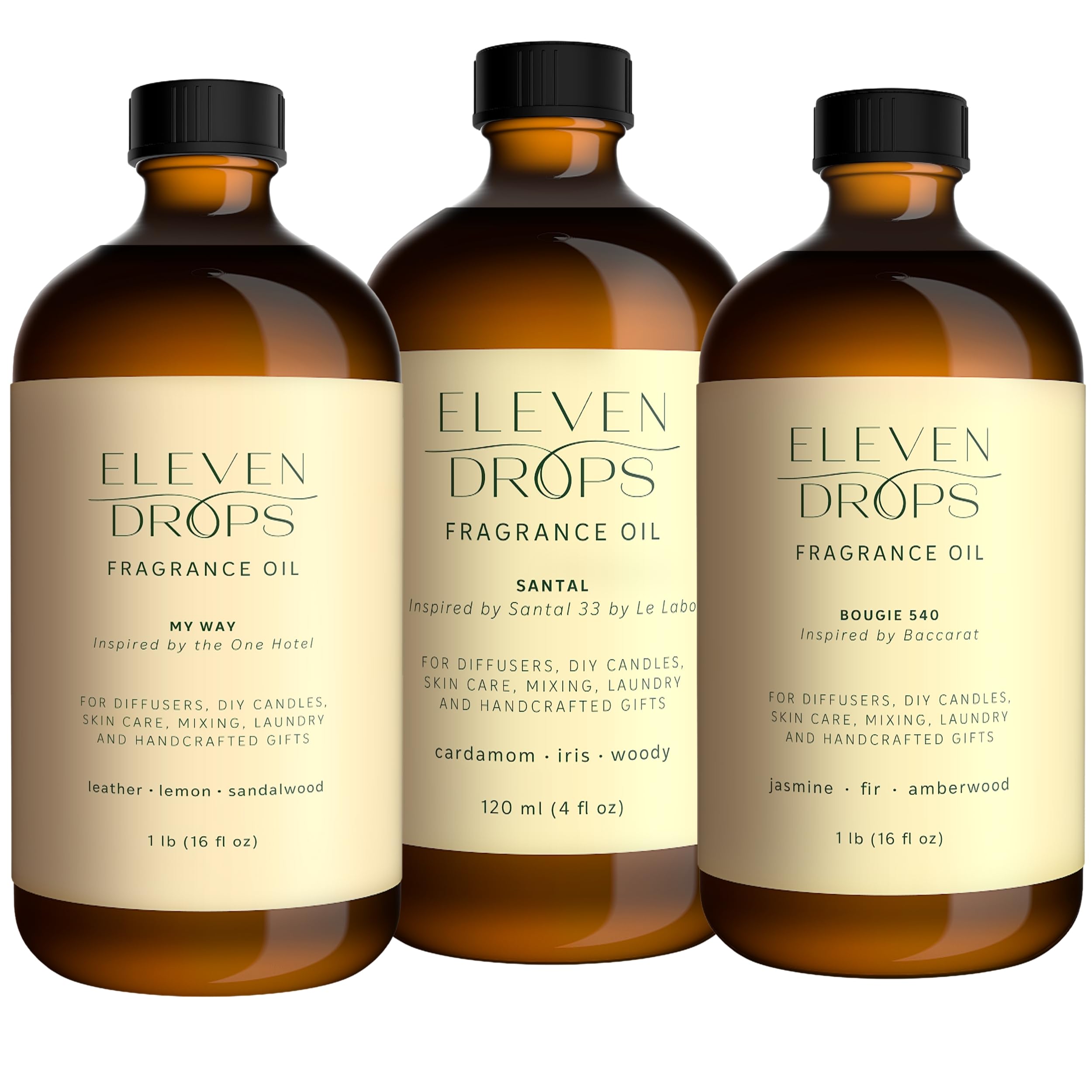 Step into a world of luxurious scent with the Bougie 540 Santal My Way Fragrance Oil Bundle — a premium trio of full-size 16 oz oils that offer sophisticated, long-lasting aromas for home, crafting, and business use. Perfectly balanced between bold, smooth, and modern profiles, this set is made for diffuser lovers, self-care enthusiasts, DIY creators, and premium product makers. Bougie 540 delivers a statement-making blend of saffron, amberwood, jasmine, and cedarwood — warm, slightly sweet, and boldly luxurious. Santal softens the mood with creamy sandalwood, musk, cardamom, and violet — clean, grounded, and subtly sensual. My Way completes the trio with a refined blend of bergamot, amber, light woods, and vanilla — fresh, modern, and effortlessly inviting. Each oil is non-diluted, long-lasting, and made in the USA. Our formula is IFRA compliant, vegan, cruelty-free, paraben-free, petroleum-free, and safe for use around kids and pets when used as directed. Whether you're scenting your home or crafting for your brand, this bundle gives you powerful tools to create mood, ambiance, and sensory connection. Use in ultrasonic, cold-air, or reed diffusers, or add to candle and soap making, linen sprays, dryer balls, floor wash, laundry, or branded packaging like tissue, shipping inserts, and more. These oils perform beautifully in both personal and commercial settings. From everyday rituals to elevated gift ideas and handmade products, this trio offers the range and quality you need to make a lasting impression — drop by drop.Driven by Passion – At Eleven Drops, we believe in the power of scent to transform spaces and uplift lives—one drop at a time. Crafted with Care – Our oils are never mass-produced they're blended in small batches to ensure consistency, purity, and unforgettable scent quality. For Diffusers DIY Use – Perfect for ultrasonic and cold-air diffusers, candles, soaps, laundry, linen sprays, and home scenting. Pet-Friendly Formula – Safe to use around pets when diffused properly no harsh chemicals, fillers, or additives—just mindful, mood-lifting aroma. Pure Powerful – Made in the USA with zero dilution, no water, no alcohol—just 100 pure fragrance oil for long-lasting, clean diffusion.