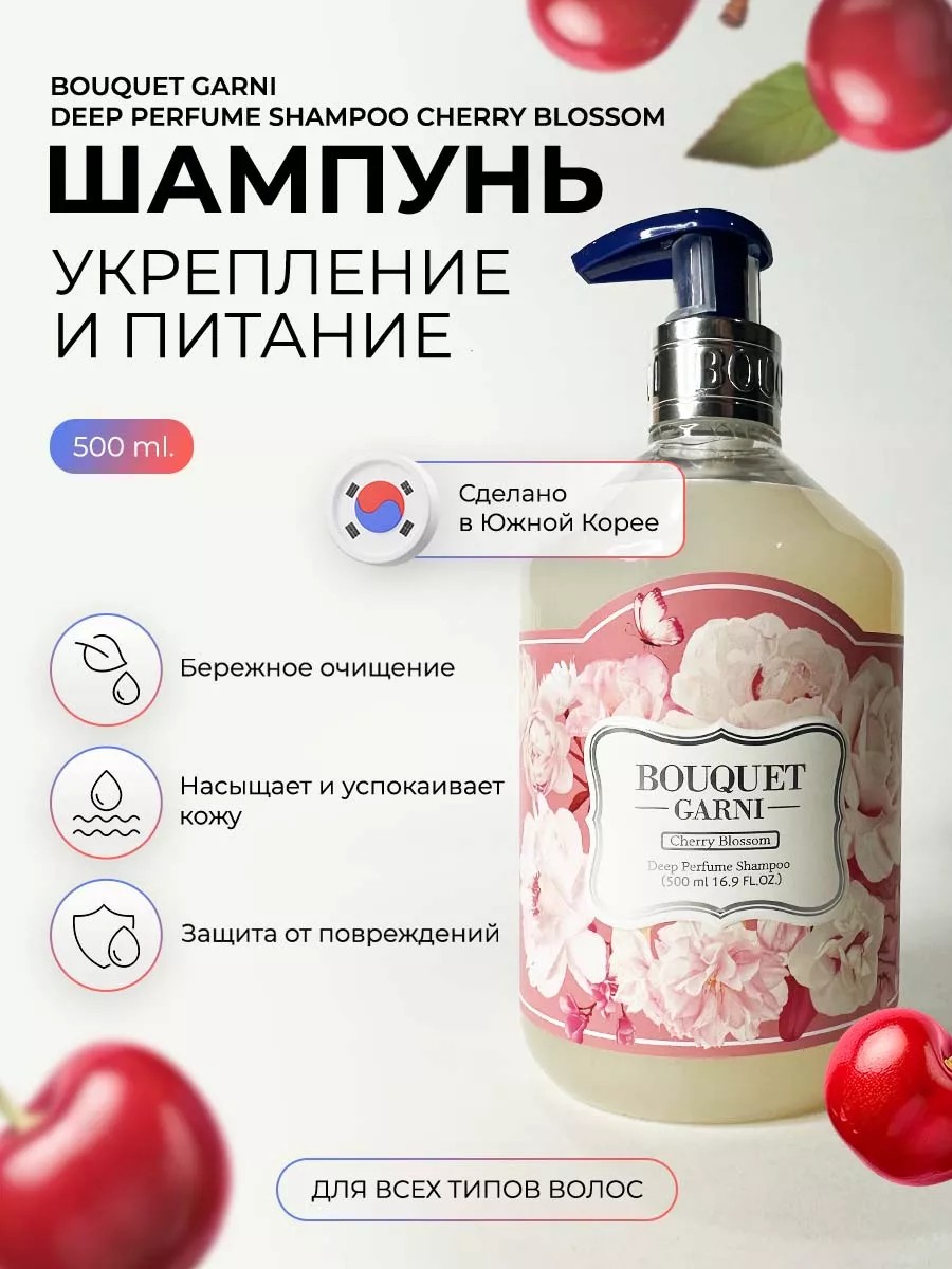 Парфюмированный шампунь Bouquet Garni Deep Perfume Shampoo Cherry Blossom бережно очищает и питает волосы, защищая их от повреждений, помогает укрепить волосы и сохранить их эластичность.
