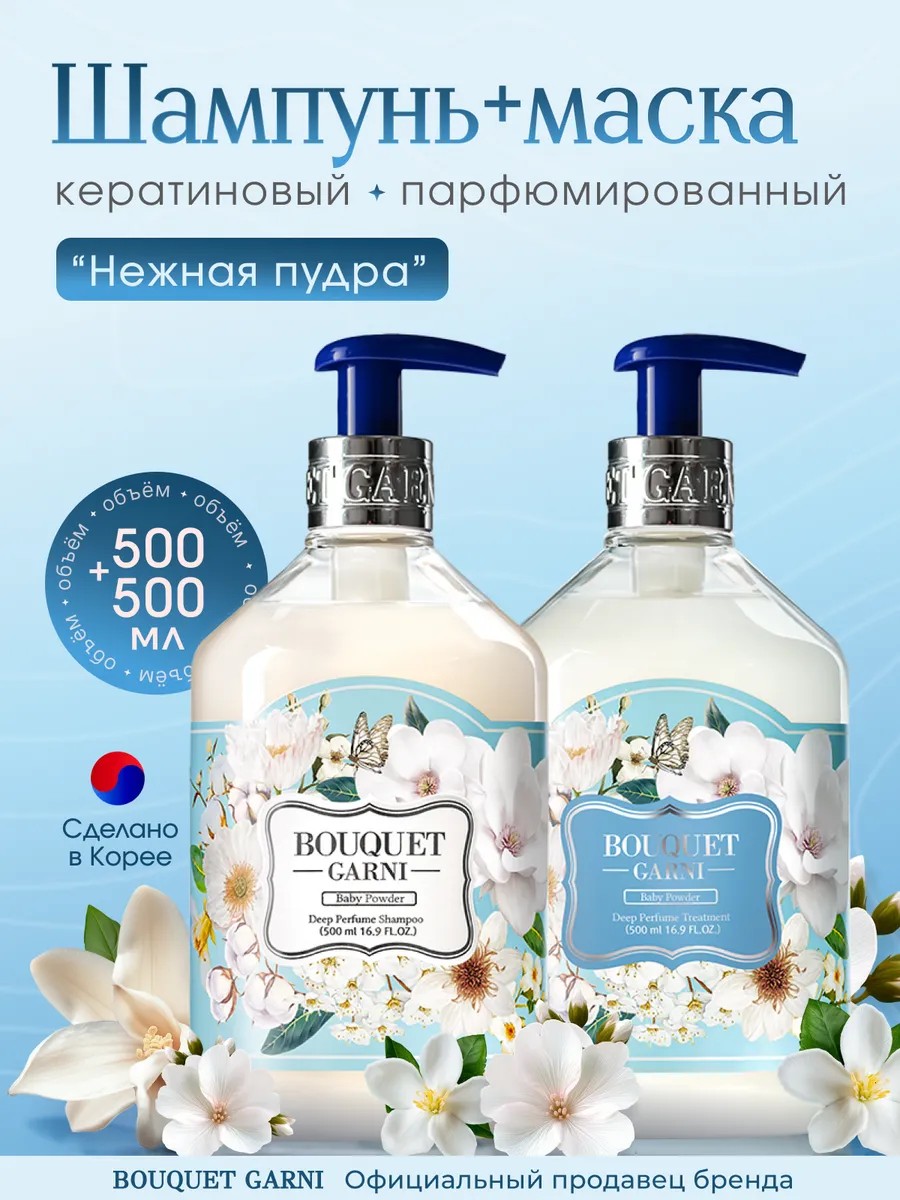 BOUQUET GARNI DEEP PERFUME SHAMPOO & TREATMENT BABY POWDER Парфюмированный набор, шампунь и маска для волос «Нежная пудра» 500+500 мл. Профессиональный уход, дополненный потрясающим парфюмированным ароматом - новый тренд из Южной Кореи.