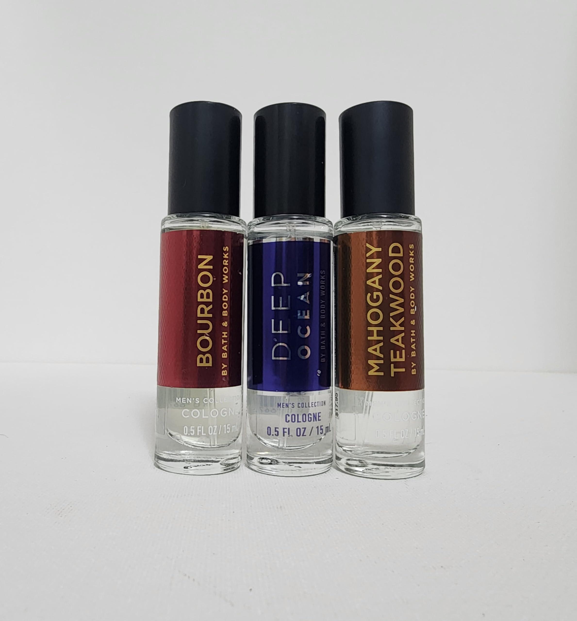 Bourbon, Deep Ocean and Mahogany Teakwood Men's Collection Colognes, each Cologne contains 0.5 FL OZ/15 mL, by Bath and Body