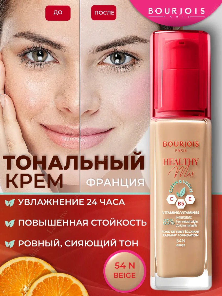 Оригинал. Увлажняющий тональный крем Healthy Mix Foundation 54 Beige бежевый от Bourjois Paris - это тональная основа под макияж со средней степенью покрытия с эффектом сияния кожи. Healthy Mix Clean & Vegan от Буржуа Париж стойкий - обеспечивает мгновенно увлажненный цвет лица, эффект фотошопа и сияющую кожу на 24 часа.