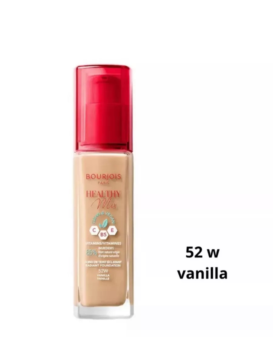 Bourjois Healthy Mix Foundation. The soft and lightweight texture of this vitamin-rich Healthy Mix foundation conceals imperfections, helping you achieve a radiant, flawless complexion thanks to its vitamin-enriched formula. This foundation enhances natural radiance, improves skin elasticity, and visually reduces the depth of wrinkles. The radiance and hydration last for 8 hours. Bourjois Healthy Mix Foundation