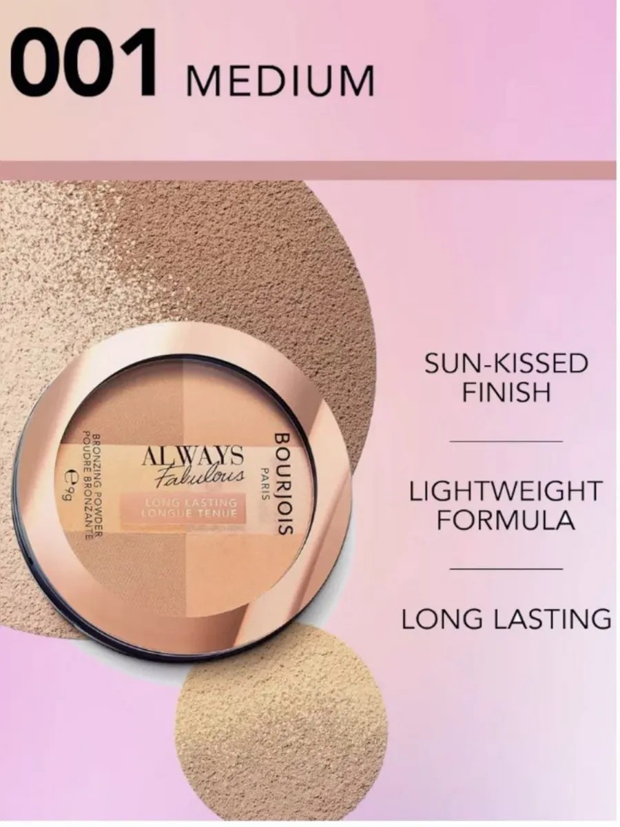 Bourjois Always Fabulous Bronzer 001 Medium, 9g (1 pc.) Achieve a long-lasting glow with Bourjois Always Fabulous Bronzing Stone Powder. This bronzer contains particles in six perfectly coordinated shades that create a tanned effect and give your face a youthful glow. With its harmonious combination of pink-beige and light brown, or dark copper and dark brown, this universal bronzer will suit any complexion. Apply Bourjois Always Fabulous Illuminating Bronzer under your cheekbones and gently blend over your entire face to brighten or accentuate your complexion, and… voila – you can enjoy summer all year round!
