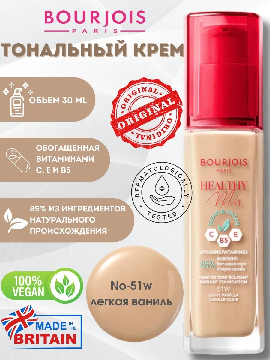 Тональный Крем Bourjois Paris Healthy Mix No51W — это отличное средство для тех, кто ищет лёгкое, увлажняющее покрытие с естественным сияющим финишем, которое при этом обеспечивает стойкость и комфорт на протяжении всего дня.