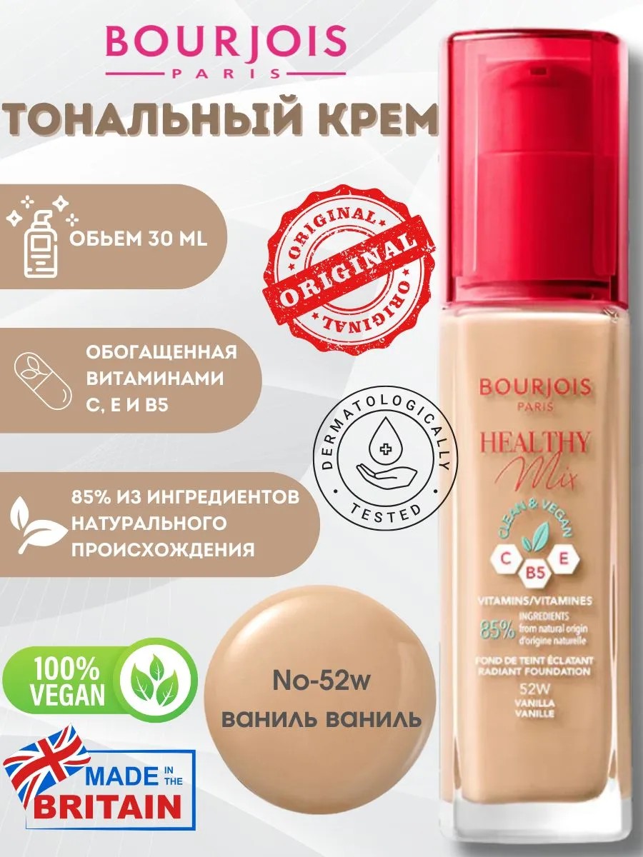 Тональный Крем Bourjois Paris Healthy Mix No52W — идеальный выбор для тех, кто ищет лёгкое, увлажняющее и сияющее покрытие с естественным эффектом, которое сохраняется на протяжении дня и придает коже здоровый, свежий вид.