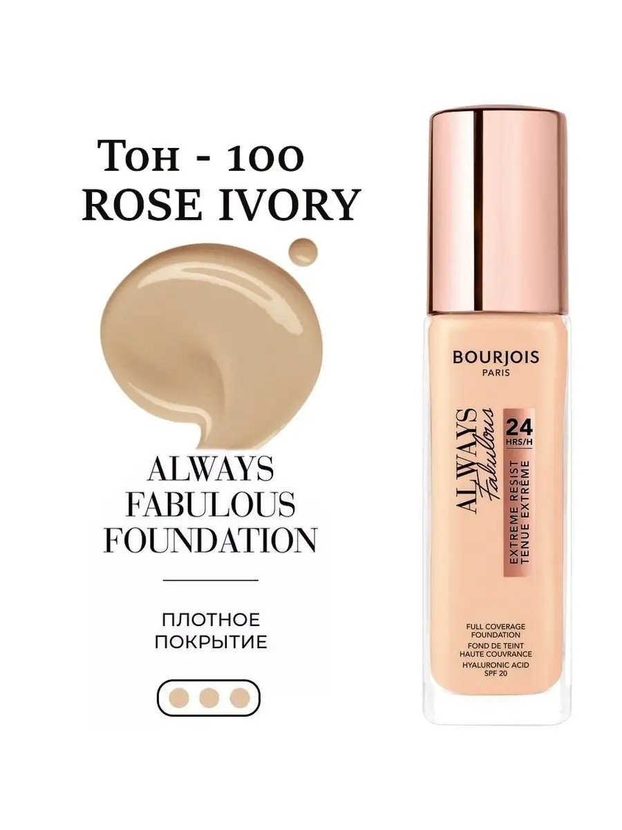 Оставайся безупречной весь день и всю ночь с новым стойким тональным кремом Always Fabulous 24 часа от Bourjois. Нежная французская текстура позволяет легко наносить крем, а плотное матовое покрытие скроет все несовершенства. Always Fabulous 24 часа выдержит темп твоей жизни: тон останется на месте в любой ситуации благодаря специально разработанной технологии. Формула с витамином E и SPF20 подарит лицу увлажнение и защиту.