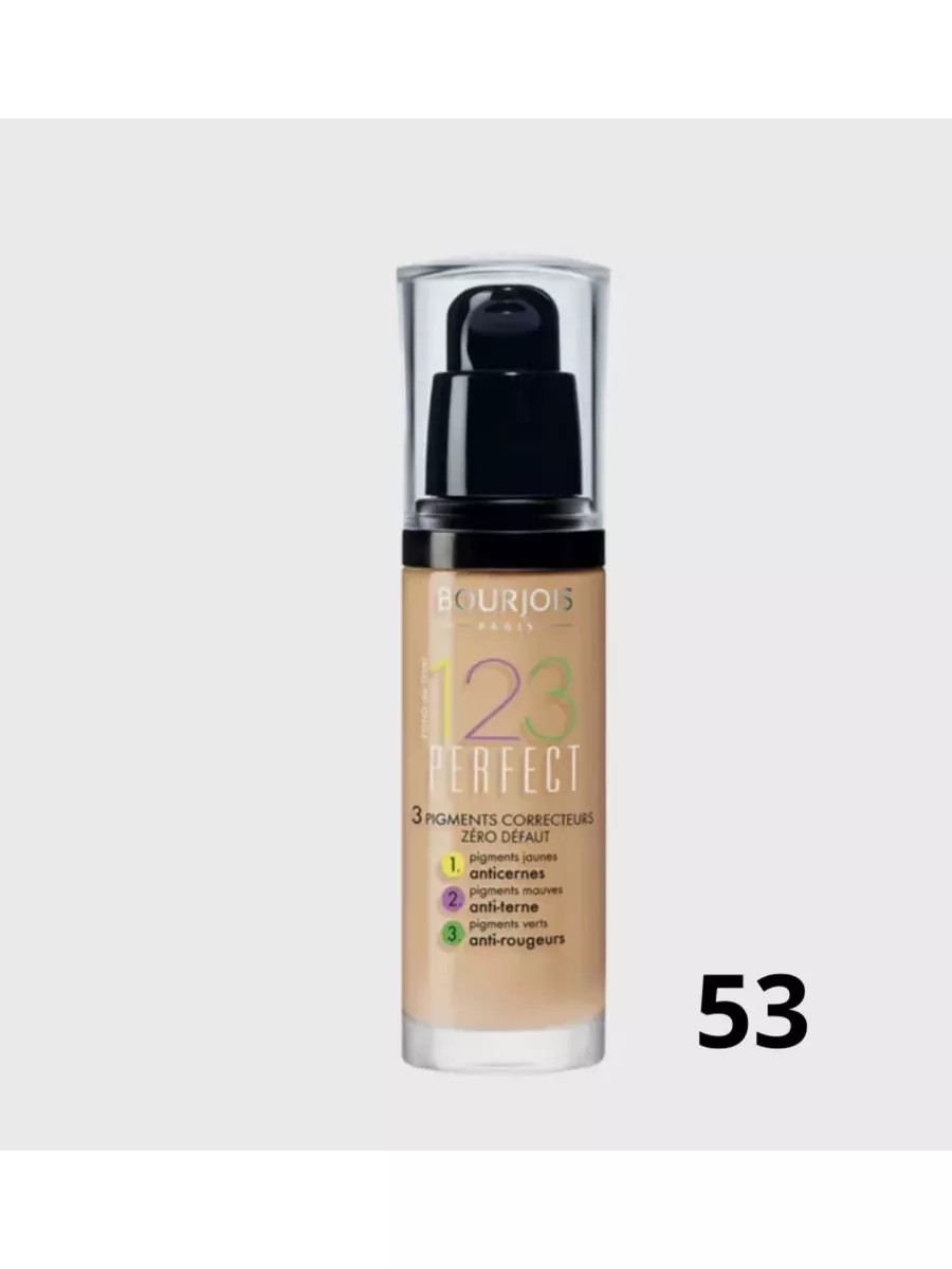 Bourjois 123 Perfect Original Foundation! 3-in-1 complexion-correcting foundation. Formula with three corrective pigments: yellow concealer pigments for a smoother appearance. Anti-dullness violet pigments for a radiant complexion. Green pigments against redness. This foundation perfectly evens out skin tone for up to 16 hours. It has a soft, melting texture that spreads easily over the skin, providing an invisible second-skin effect. The foundation with an anti-glare formula and cotton flower moisturizes the skin for 24 hours. Contains sun protection - SPF 10. Non-comedogenic, does not cause inflammation, imperfections, acne, and pimples. Tested under dermatological control. Original cosmetics from Europe! Benefits: - 3-in-1 concealer foundation - 3 pigments: anti-redness foundation, concealer, and radiance enhancer - Evens out skin tone - Cotton-enriched formula has a moisturizing and mattifying effect.