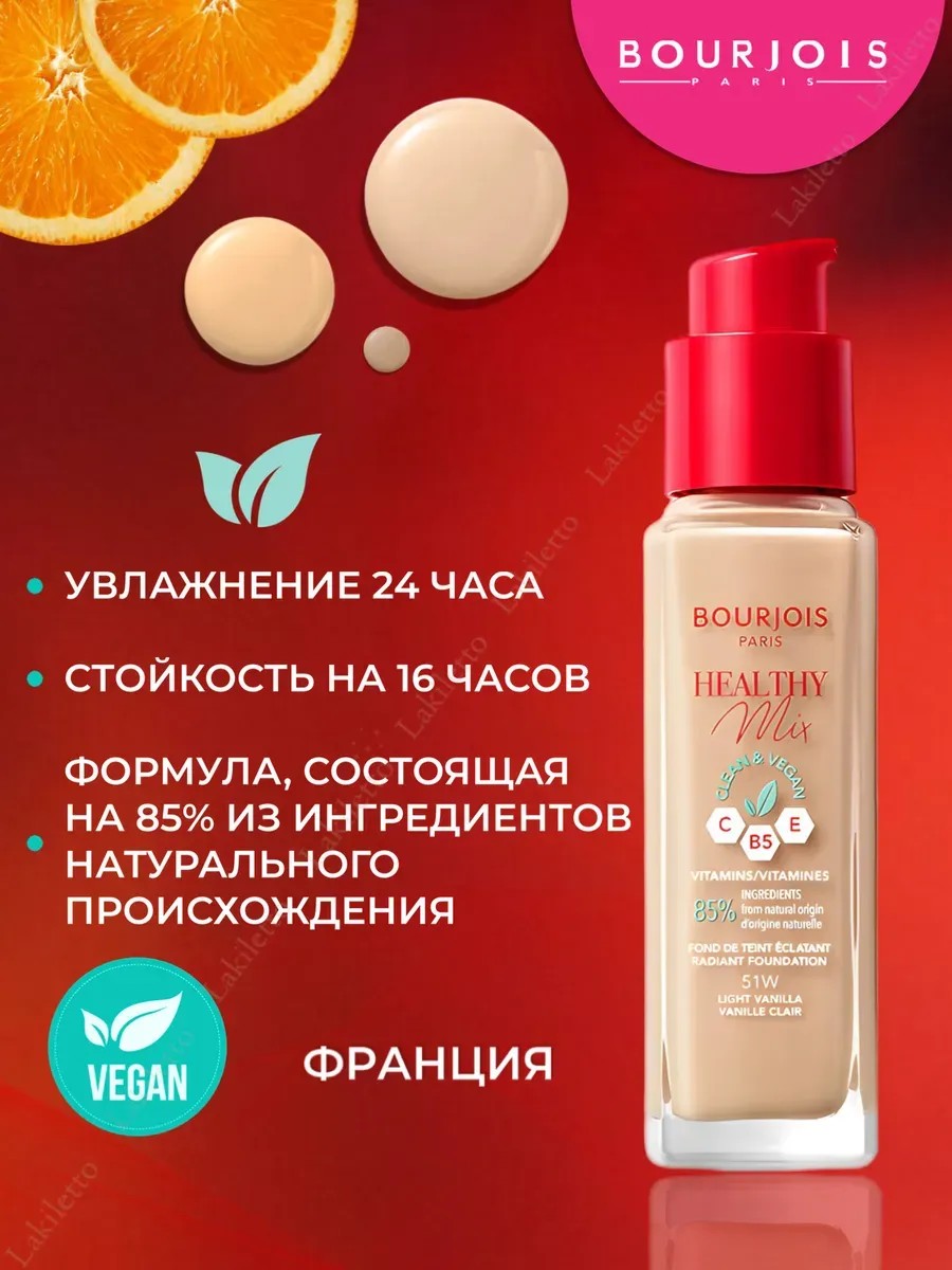 Тональный крем Bourjois Healthy Mix Foundation. Мягкая и легкая текстура с витаминно-фруктовым комплексом скрывает недостатки, помогая достичь сияющего и безупречного тона. Тональный крем усиливает естественное сияние кожи и улучшает эластичность, визуально сокращая глубину морщинок. Эффект сияния и увлажнения продлится в течение 8 часов.