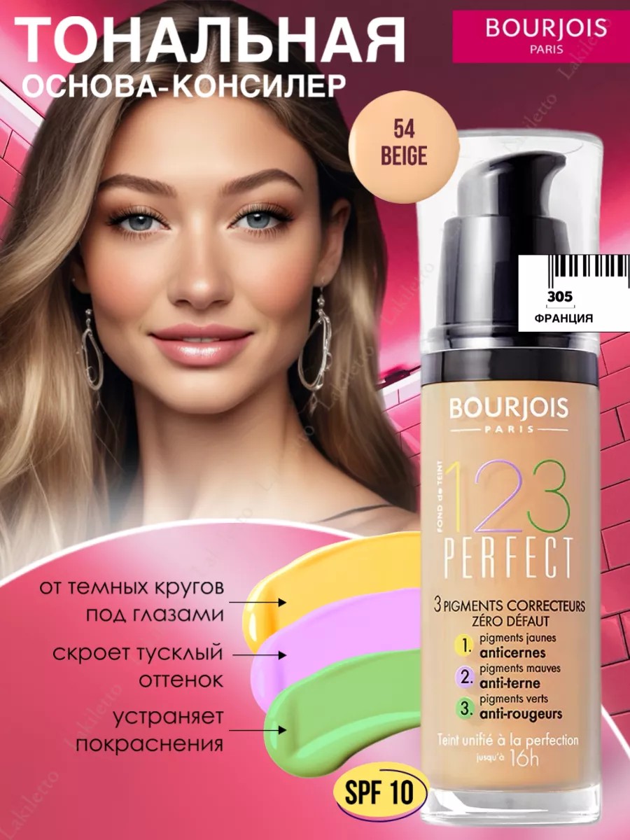The 123 Perfect Foundation by Bourjois Paris is a three-color foundation for a perfect complexion that lasts up to 16 hours. Bourjois foundation 54 beige. The 3-in-1 formula with three corrective pigments evens out skin tone under makeup.