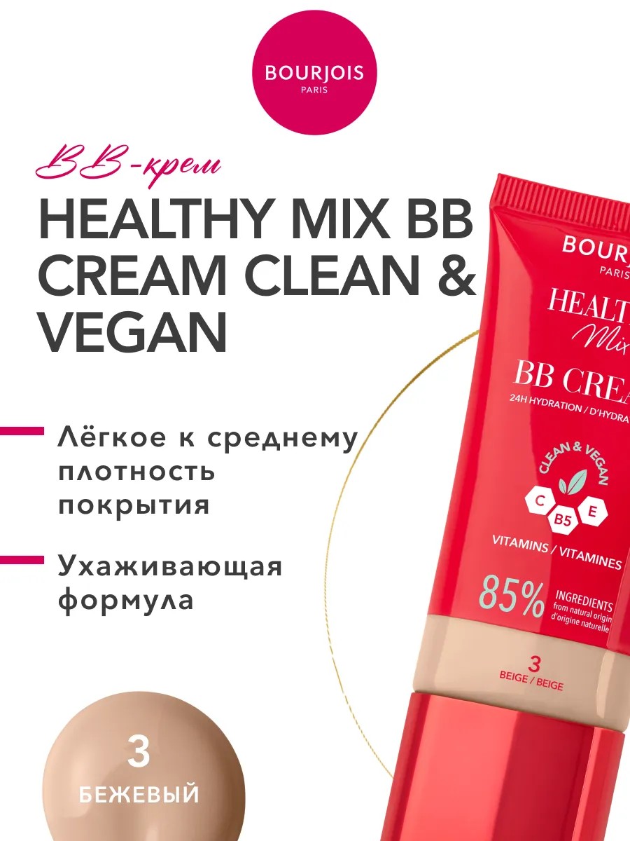 Выберите свой идеальный оттенок из гаммы от светло-бежевого до теплого песочного. Подарите коже здоровое сияние и безупречный вид с тоналкой для лица Healthy Mix BB Cream Clean & Vegan от французского бренда буржуа косметика Bourjois – инновации в макияже для осознанной красоты.