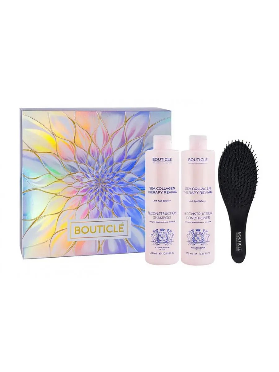 Состав набора:Восстанавливающий шампунь для волос с морским коллагеном Sea Collagen Therapy Revival Reconstruction Shampoo 300 млВосстанавливающий кондиционер для волос с морским коллагеном Sea Collagen Therapy Revival Reconstruction Conditioner 300 млМассажная щетка для уходовых процедур и распутывания сухих и влажных волос Untangling Massage BrushШампунь мягко очищает волосы и кожу головы, активирует процесс ревитализации, возвращая волосам жизненную силу и блеск.Морской коллаген способствует восстановлению прочности и эластичности, реконструируя стержень волоса.Активная мелкомолекулярная форма гиалуроновой кислоты в составе эффективно борется с признаками преждевременного старения, активирует процессы регенерации клеток, питает и укрепляет волосяные фолликулы, смягчая и увлажняя кожу головы.Масло монои с высоким содержанием жирных кислот, и витаминов (А, Е, С) защищает от негативных внешних факторов окружающей среды, предотвращает оксидативный стресс, препятствует истончению структуры и обеспечивает дополнительную защиту цвета.Кондиционер упрощает процесс сушки и укладки, обеспечивает защиту от механических воздействий, активирует процесс ревитализации, возвращая волосам жизненную силу и блеск. Содержит морской коллаген, активную мелкомолекулярную форму гиалуроновой кислоты и масло монои. Способствует восстановлению прочности и эластичности, борется с признаками преждевременного старения волос и обеспечивает надежную защиту от негативных внешних факторов окружающей среды.Дополнительно защищает цвет, придает волосам плотность и дополнительный объем.Распутывающая массажная щетка разработана для применения в процедурах по уходу и восстановлению, а также для ежедневного ухода за сухими и влажными волосами.Двойные щетинки разной длины мягко скользят по волосам, распутывая даже самые непослушные пряди.