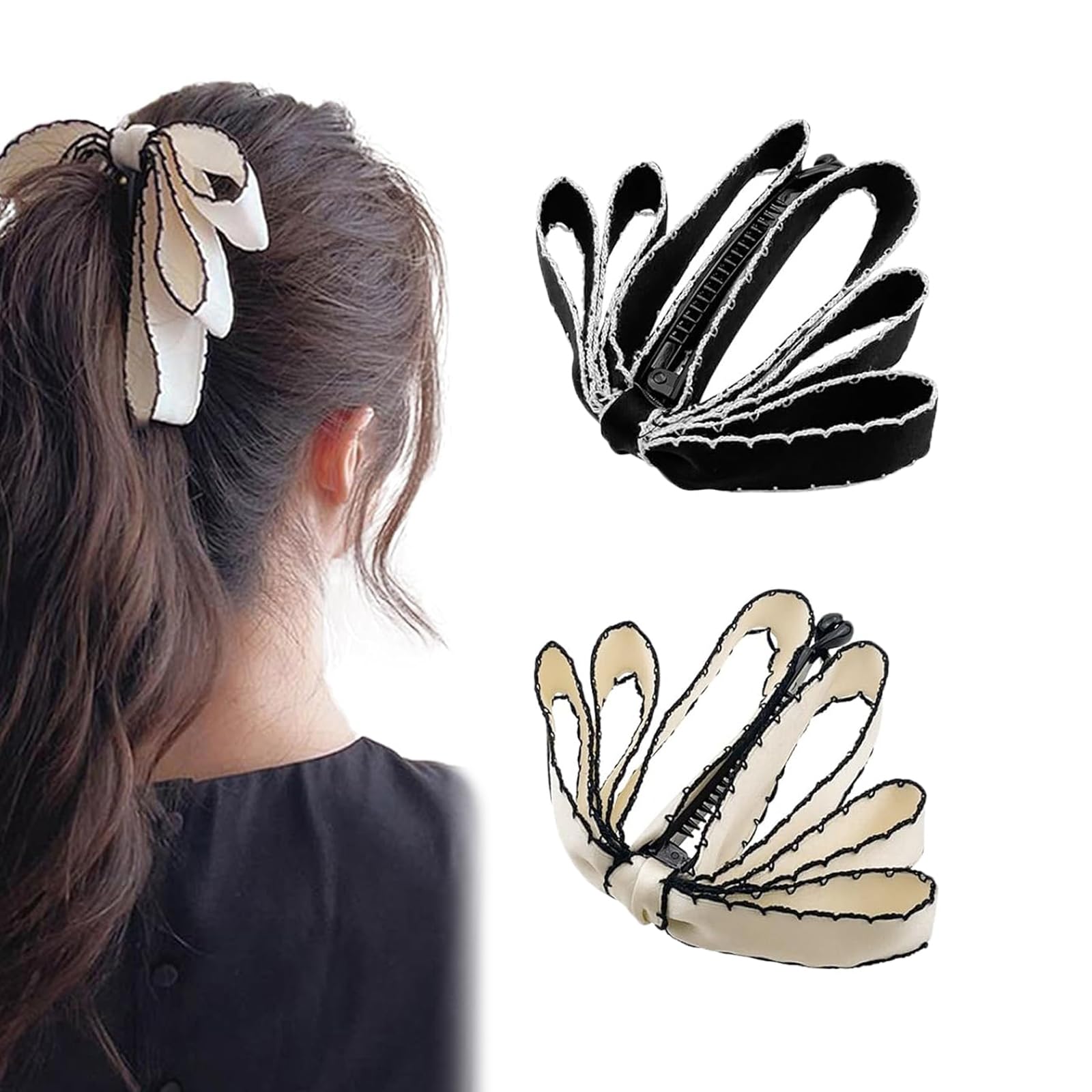 ?--------------Welcome To My Shop--------------? Bow Banana Hair Clips Ribbon Vertical Ponytail Claw Clips Bowknot Banana Hairpins Ponytail Holder Hair Barrette Accessories for Women Girls Specifications: Quantity: 2 pieces Color: Black, white Material: cloth, metal clip Package includes: 2 pieces Bow Banana Hair Clip Note: 1. Due to manual measurement, please allow 1-5mm difference. 2. Due to the difference between different monitors, the picture may not reflect the actual color of the item. Thank you!?Package Include?2 pcs bow banana ponytail hair claw clips, meet your need for decoration and you will look sweeter and more elegant. ?Widely Used?Whether you are applying makeup indoors, taking a shower, washing your face, exercising, cooking, partying outdoors, or shopping, claw clips can not only keep your hair neat and make you look beautiful but also can be the best choice for gifts. ?Design?The bow design composed of fabric is very classic and beautiful, a fashionable style, that adds brilliance to your hair. Banana Hair Clip With Bow make you charming and chic, also use them to match your daily clothes. ?Material?These Bow Banana Clips for Women are made of plastic and ribbons, keep your hair comfortable, and will not scratch your scalp, great for hair curly or straight. ?Bow Banana Hair Clip?The bow hair claw jaw clips are suitable as ponytail bow clips, when wearing this Banana Hair Clip with Bow, you will appear younger and more energetic.