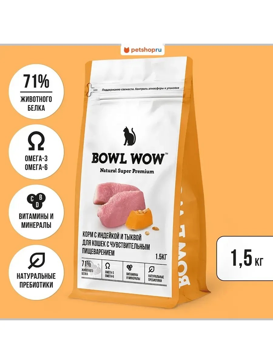 BOWL WOW Сухой корм для кошек с чув. пищ. с индейкой и тыквой, 1.5 кг