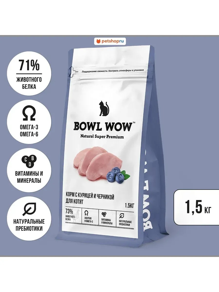 BOWL WOW Сухой корм для котят с курицей и черникой, 1.5кг